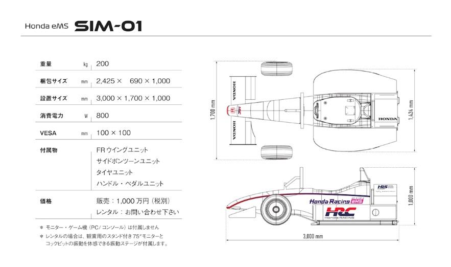 「Honda eMS SIM-01」のサイズは全長3,000mm × 全幅1,700mm × 全高1,000mmで、およそ畳一枚分ほどのスペースがあれば設置可能とのこと。付属品は、造形されたユニットとしてフロントウイング・サイドポンツーン・タイヤ、実際に操作するユニットとしてハンドル・ペダルが含まれています。