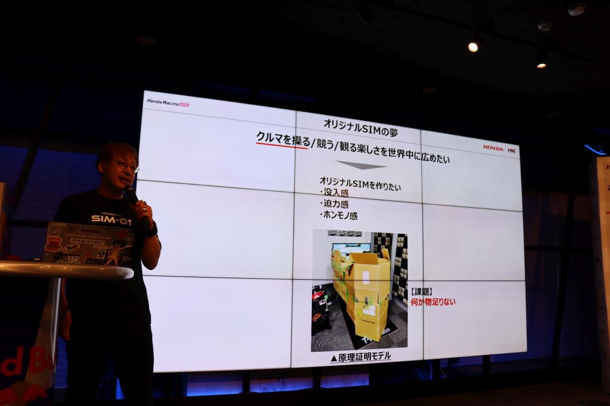 HRCが掲げるeMSは、モータースポーツの新しい入り口を目指し、「操る楽しさ」「競う楽しさ」「観る楽しさ」という3つの楽しさを多くの人と共有しようとしているとのこと。そして、クルマを操る楽しさという面で「オリジナルのシミュレーターを自分たちの手で作りたい」という夢を長年抱いており、今回の「Honda eMS SIM-01」開発に至ったと岡氏は語りました。