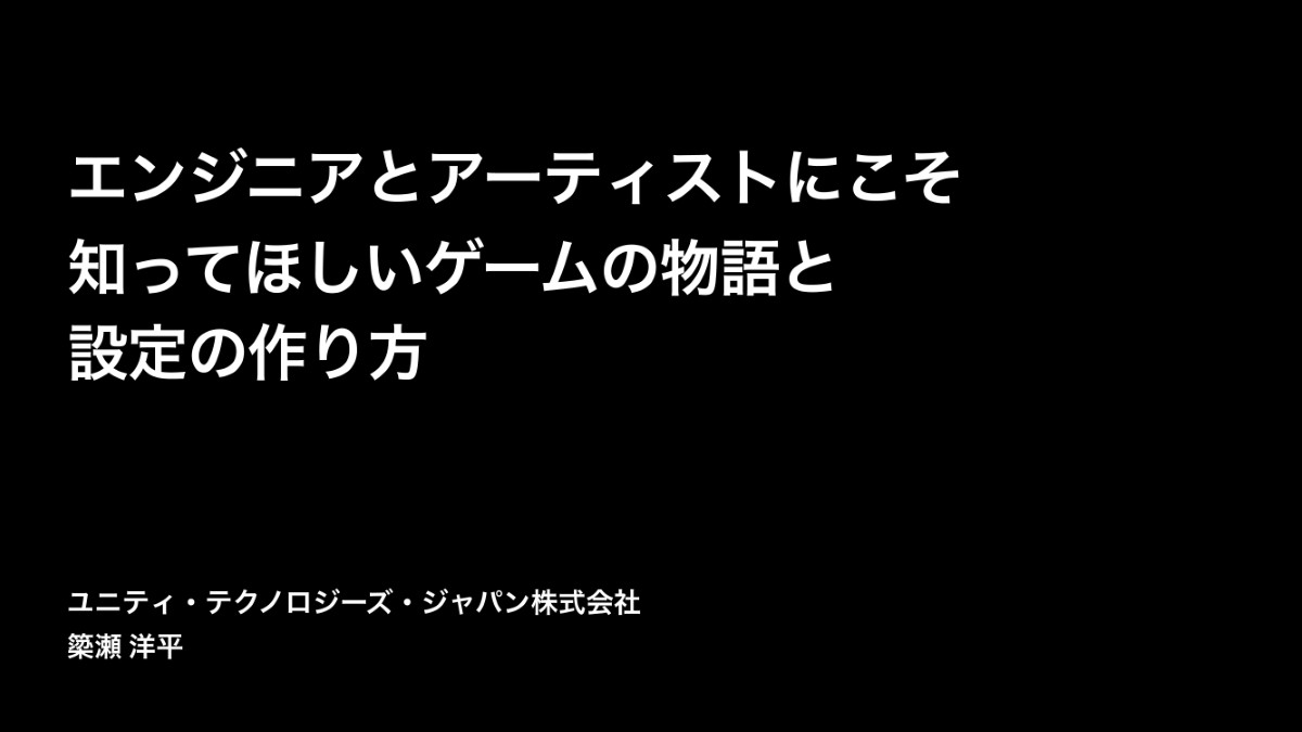 本イベントでは、ゲームづくりに関する10本の講演が行われました。その中から、ユニティ・テクノロジーズ・ジャパン株式会社 𥱋瀨 洋平氏による「エンジニアとアーティストにこそ知ってほしいゲームの物語と設定の作り方」のの講演動画およびスライドを公開します。