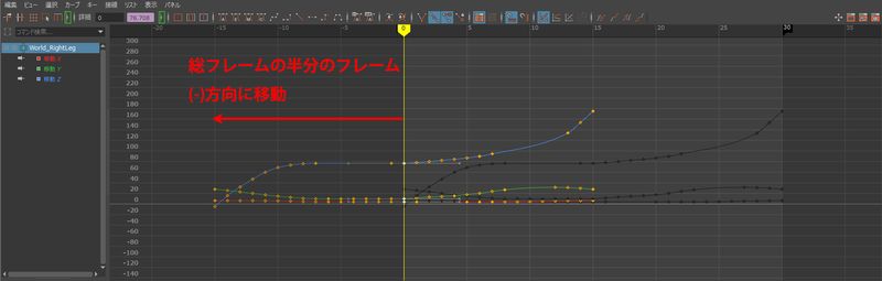 先に左足のアニメーションカーブを完成させ、それを右足用に複製し、再生タイミングをずらすことで、左右交互に足を踏み出す動きを作成します。
