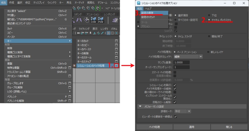 チャネルボックスから「シミュレーションのベイク処理オプション」を設定するための準備手順を説明した画像(画像はブログ記事より引用)