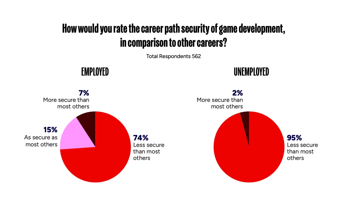 また、回答者の約4分の1(24%)は、過去2年以内にレイオフを受けたと回答。就労中の回答者のうち74%、失業中の回答者95%は、ゲーム開発を「(他業種と比較して)より不安定な職業である」と回答しています。