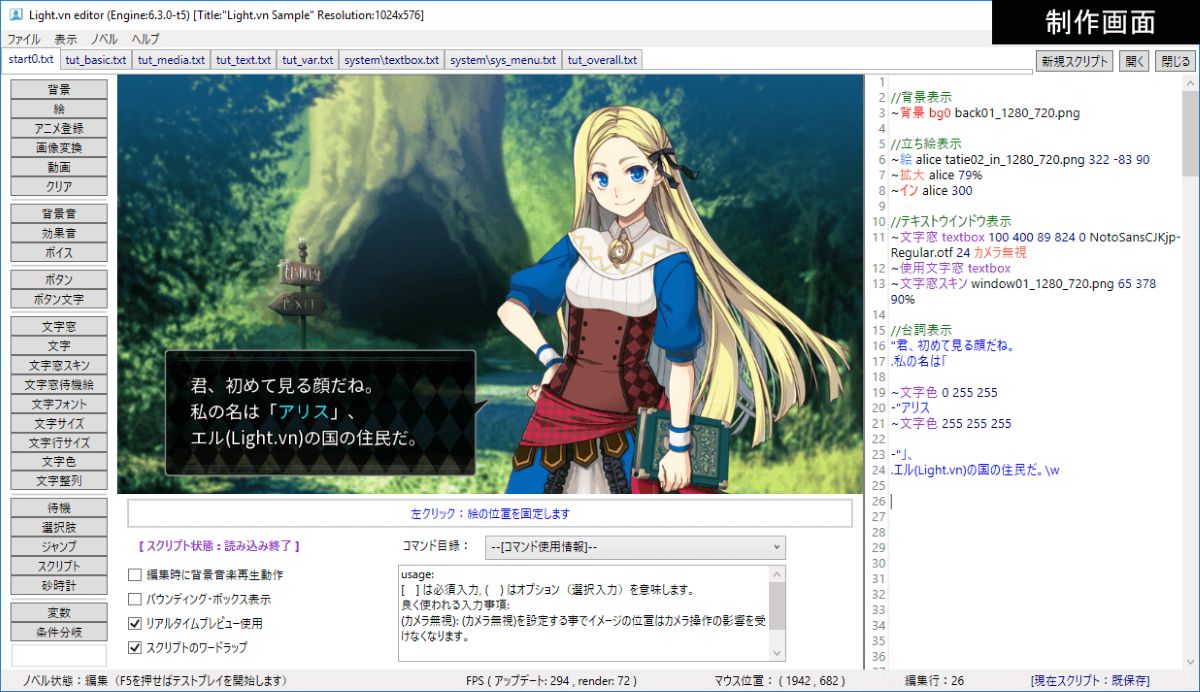 「Light.vn」は日本語をベースとしたスクリプトを採用しており、シナリオの執筆に近い感覚でゲーム開発を行えることを特徴としています。