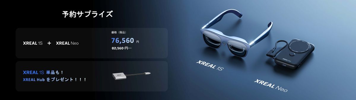 新製品の発売を記念して、「XREAL 1S」と「XREAL Neo」のセット販売も実施される。通常価格82,560円(税込)のところ、6,000円引きの76,560円(税込)で購入できる。また、XREAL 1Sを予約した方には特典として「XREAL Hub」がプレゼントされる。予約は2025年12月1日(月)より開始し、XREAL公式サイトや取り扱い販売店で受付中だ。2026年1月下旬より予約受付順に発送される予定だ。