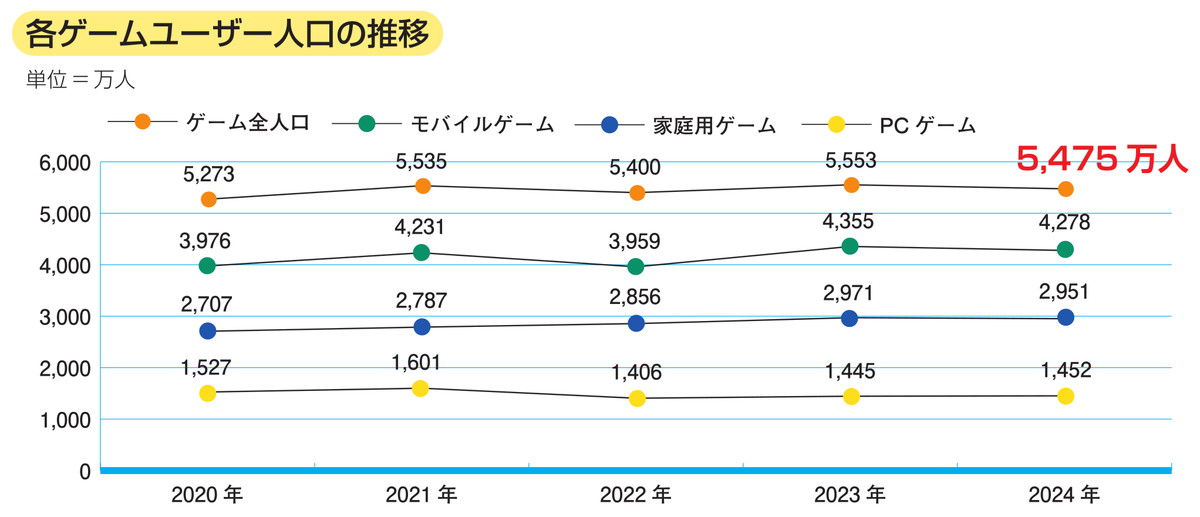 2024年の国内ゲーム人口は5,475万人。前年の5,553万人から微減という結果で、ここ数年は横ばいとなっています。2025年においては、Nintendo Switch 2の発売によりユーザー数の増大が期待されると見解が語られています。