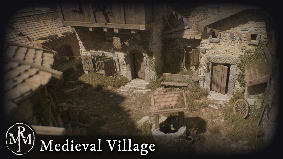 古びた石造りの家屋が並ぶ、中世風の村落を作成できるモジュラー式の環境アセットです。形状やサイズが異なる建物の屋根や壁、樽、旗、はしご、樹木など合計496のメッシュが用意されています。