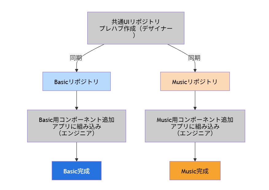 UI要素の制作後、共通リポジトリで管理されているUIを各アプリに同期する際、「EsBasic」や「EsMusic」といったタグを付与することで、不要なオブジェクトやフォルダを自動で削除する仕組みを構築しています。これにより、同じプレハブを使いながら、それぞれのアプリに最適化された状態で出力されるようになりました。