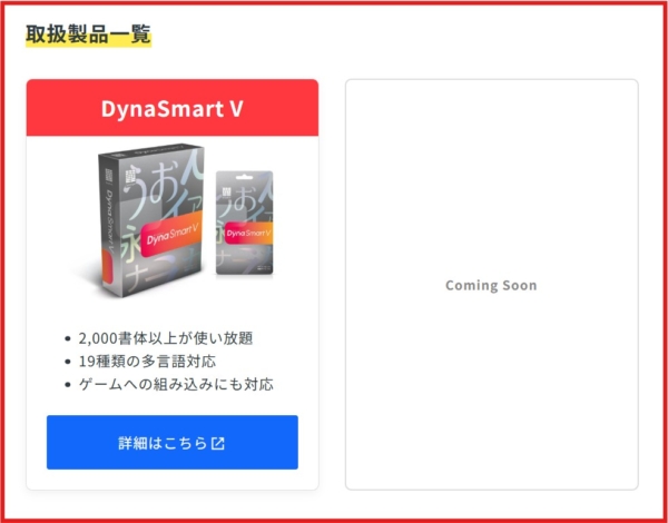 ゲームメーカーズが販売する最初の製品は、多言語フォントを含むダイナフォント全書体2,000書体以上が使用できる年間ライセンス「DynaSmart V」です。
