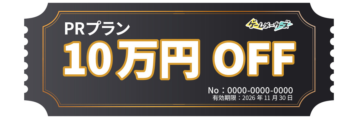 ※本チケットは、ゲームメーカーズが提供するPRプランを対象に、10万円割引を適用するものです。発行期間・有効期限・適用条件をご確認のうえ、お問い合わせフォームよりお申込みください。内容は予告なく変更または終了する場合があります
