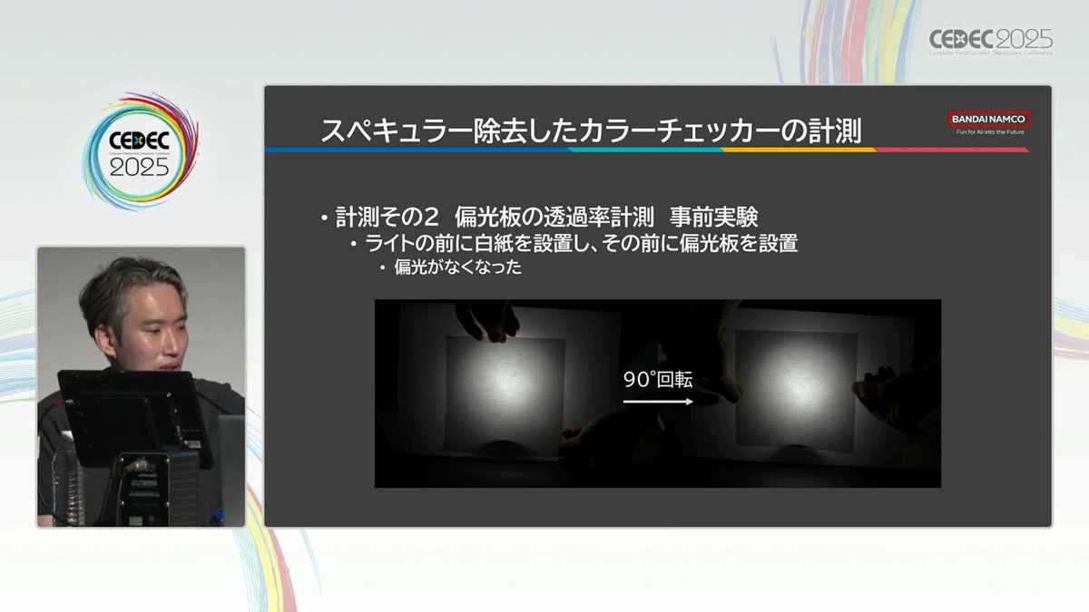 計測項目は、スぺキュラー除去前/後のパッチの反射色、基準となるパッチ(グレー)の色反射、偏光板の透過率、白紙を通した透過色の偏色など。とくに重要なのは、グレーの色反射と偏光板の透過率です。