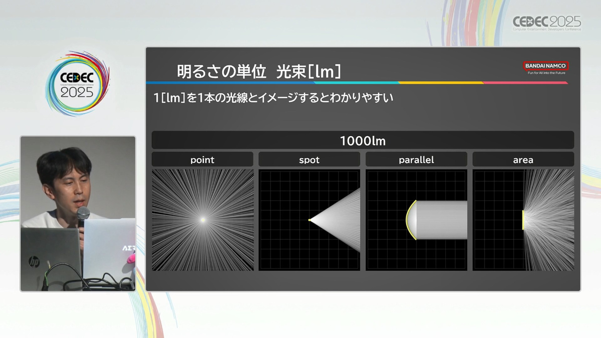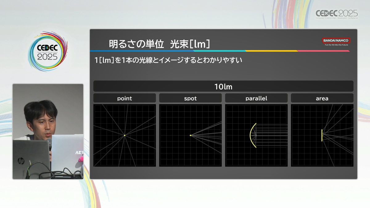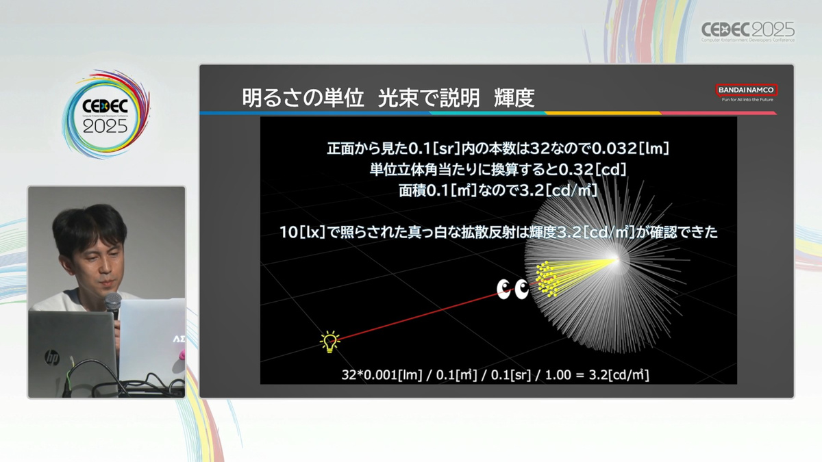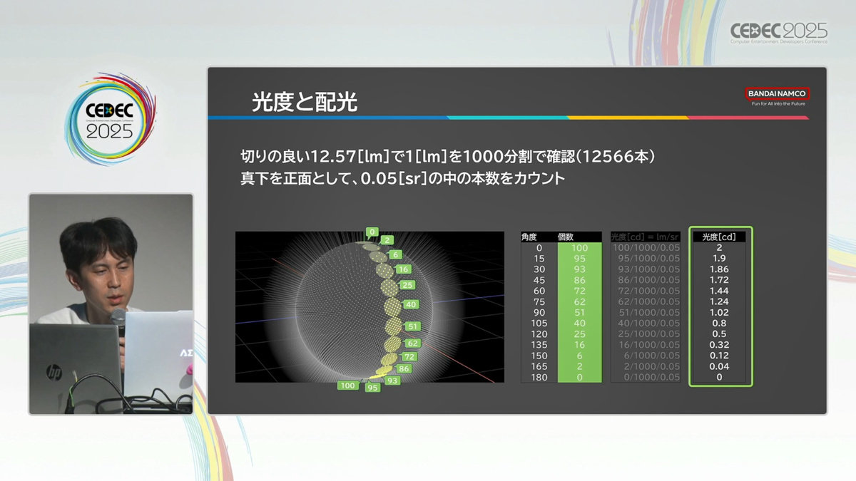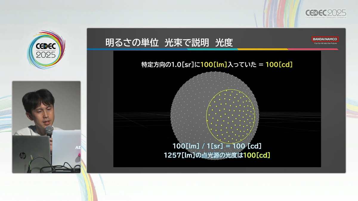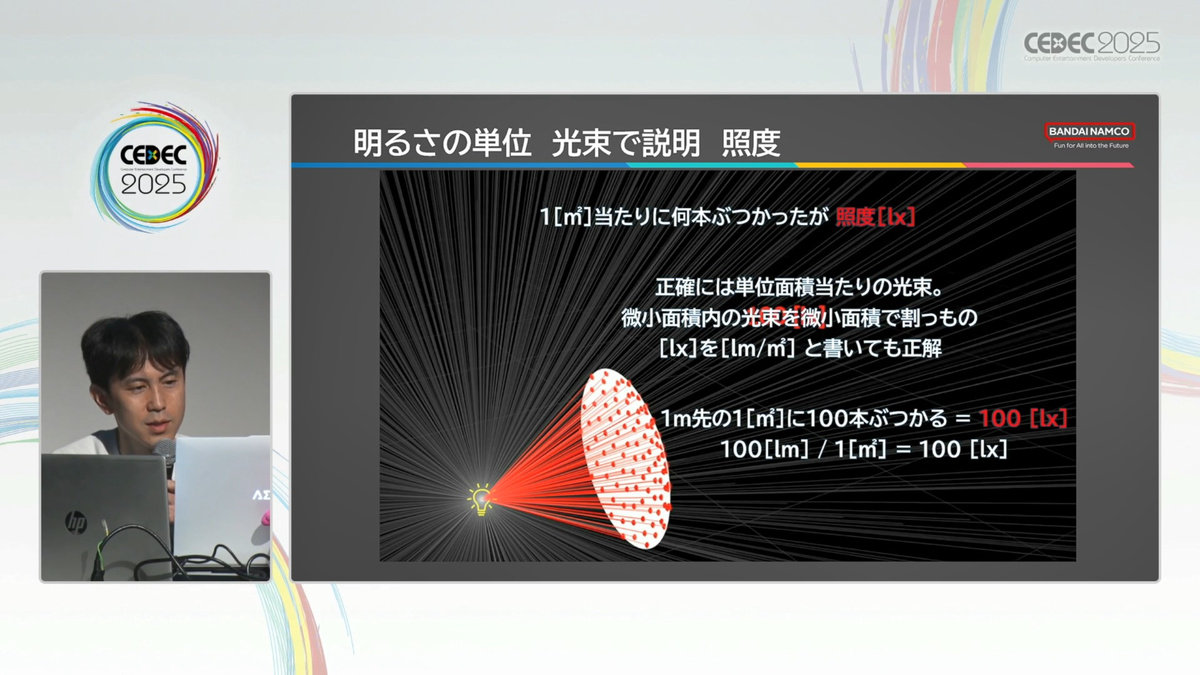※ ライトが出力するエネルギーの総量を示すパラメータ。講演ではこの数値を、現実世界の物理学における「照度」として扱っている