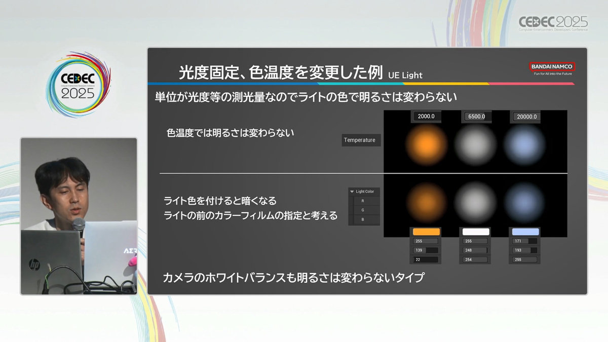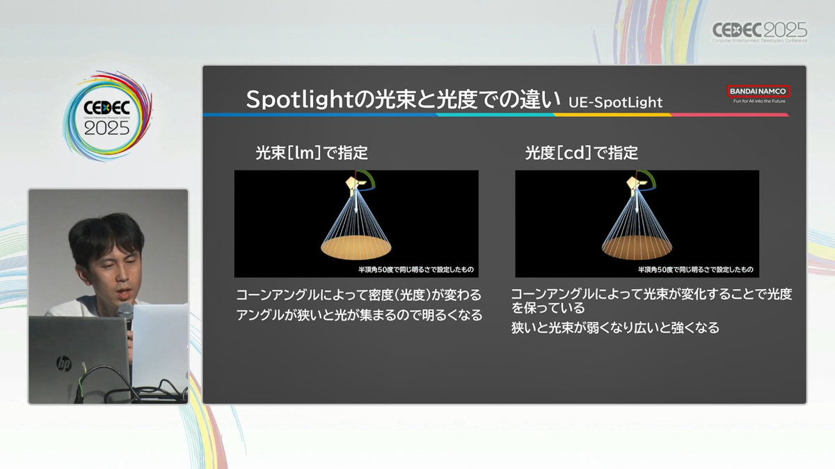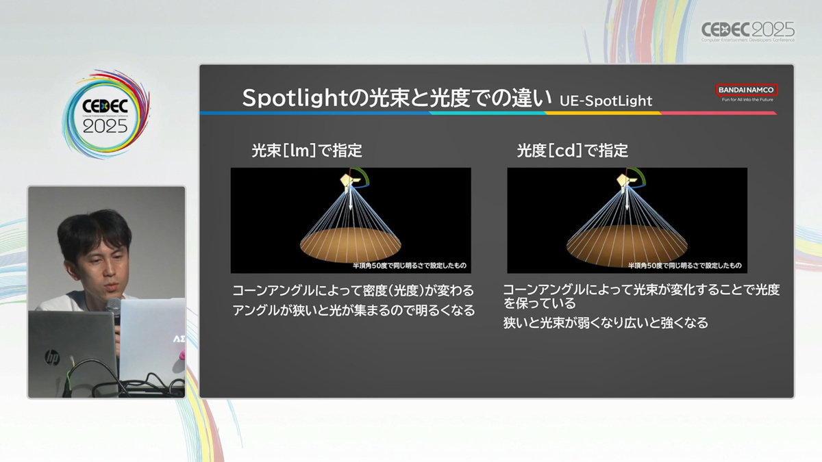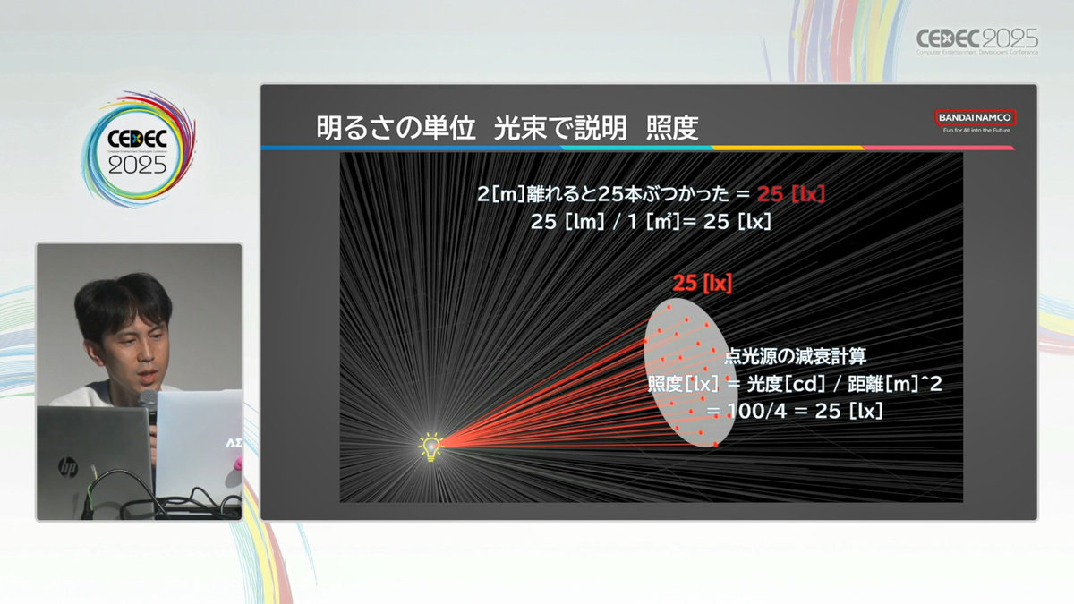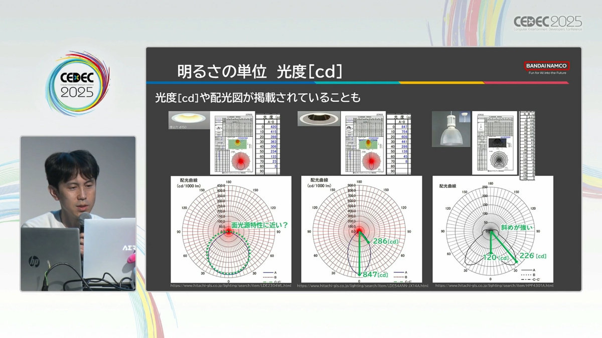 ※ ライトが出力するエネルギーの総量を示すパラメータ。講演ではこの数値を、現実世界の物理学における「照度」として扱っている