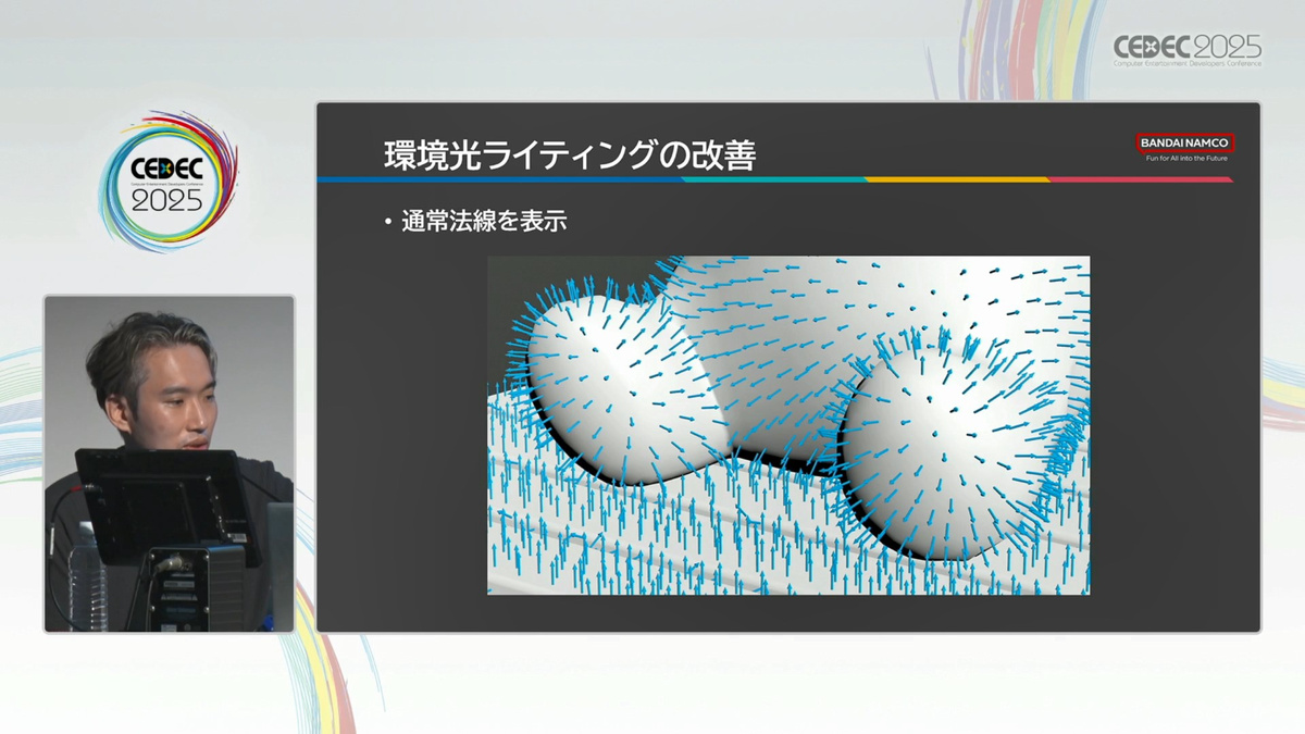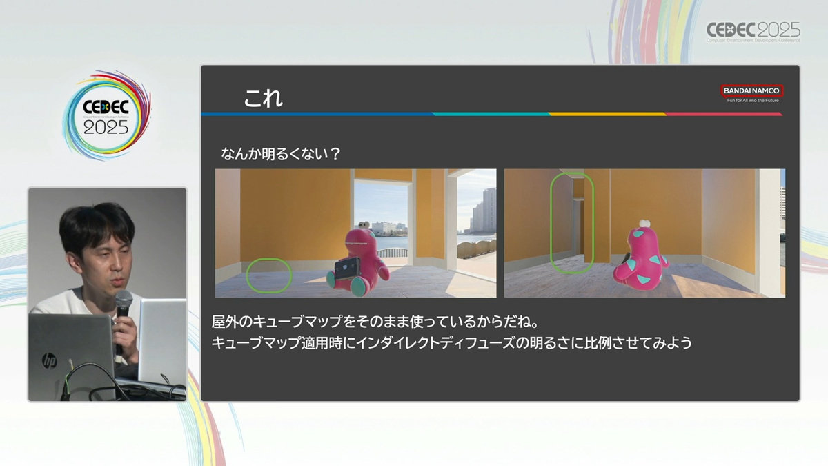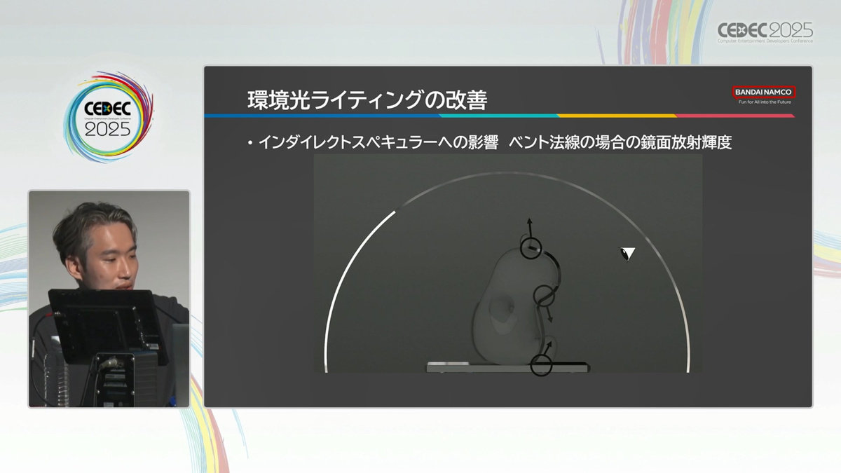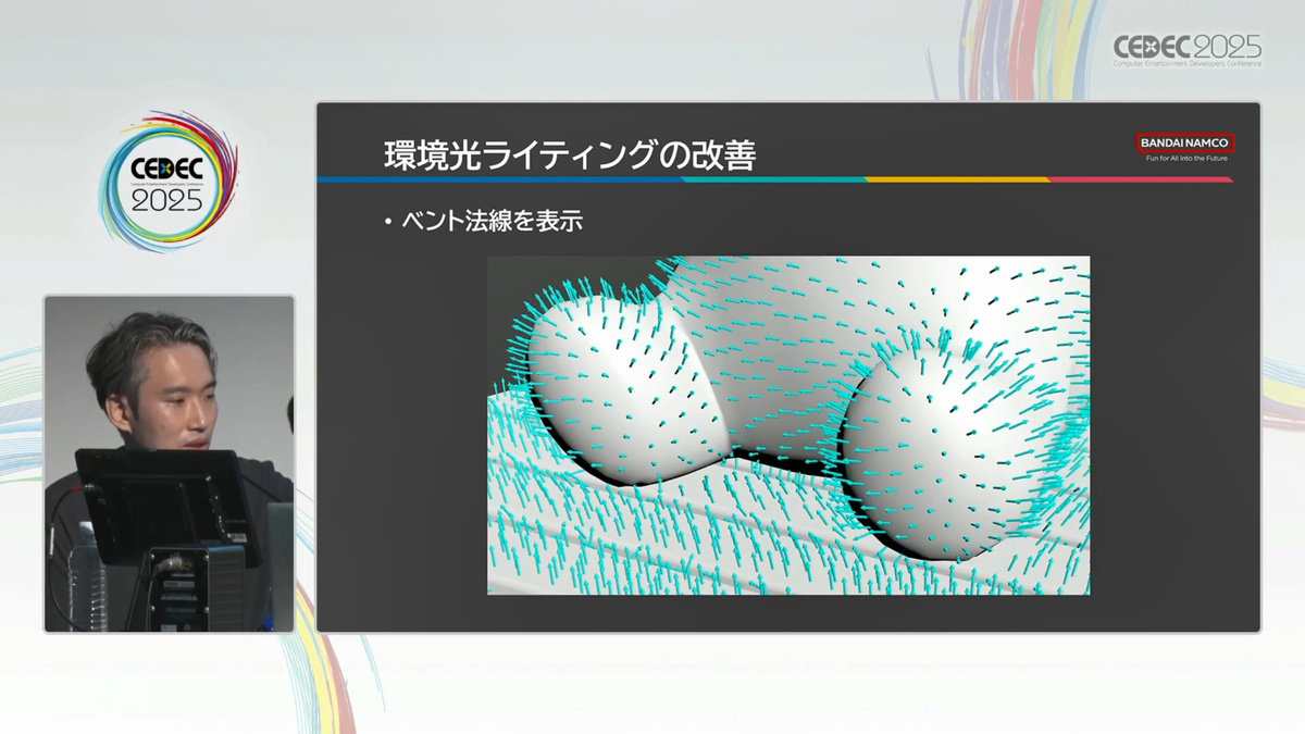 陰影差が激しい環境でのIBLにおいてスペキュラーが物体を貫通する不具合を、Bent Normal(ベント法線)により解消する手法が紹介されました。