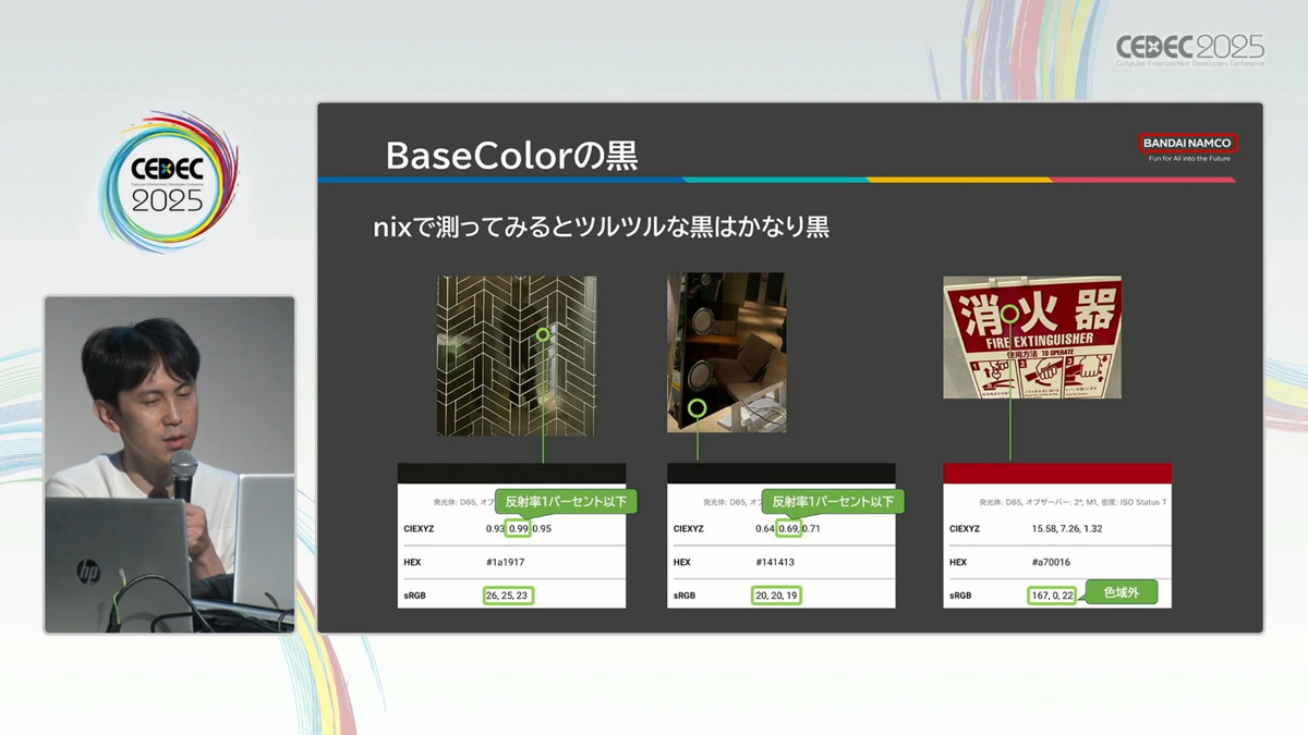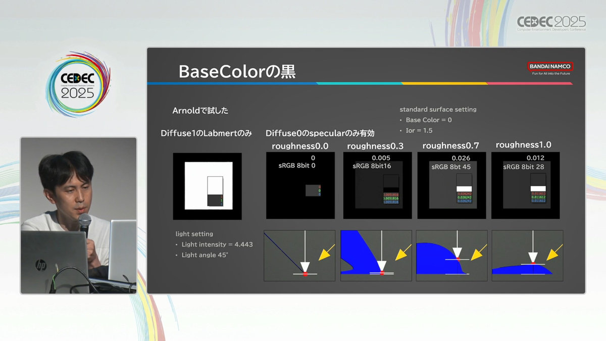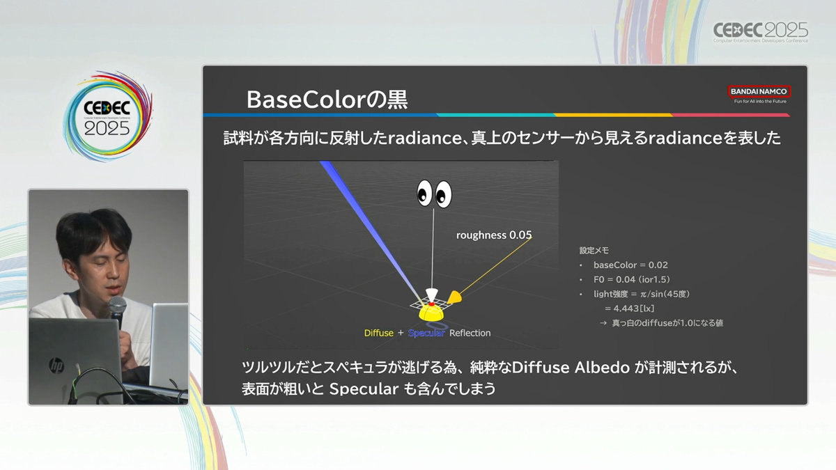 ここで、物体表面の反射率とBase Colorの関係について解説されました。