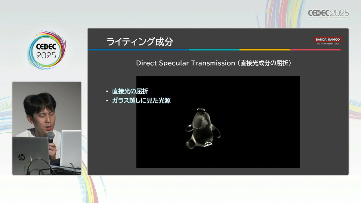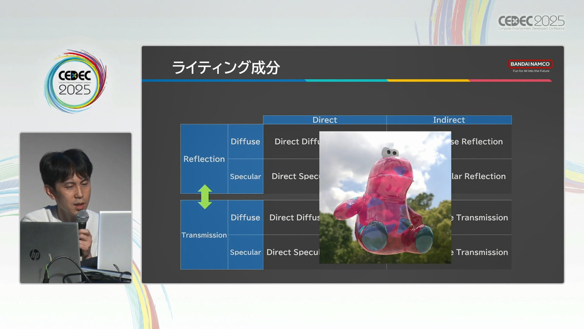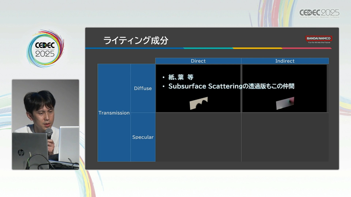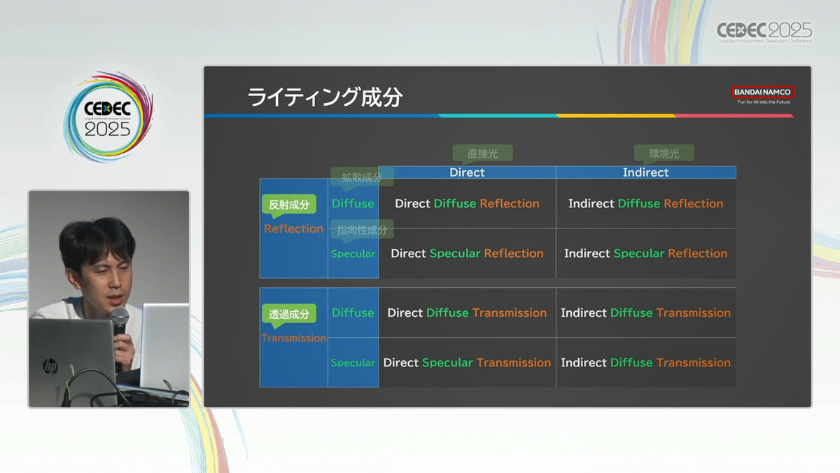 講演では、ライティングの分類方法として「直接光(Direct)・間接光(Indirect)」「拡散(Diffuse)・指向性(Specular)」「反射(Reflection)・透過(Transmission)」の要素をもとに、全8種類に分ける考え方が紹介されました。