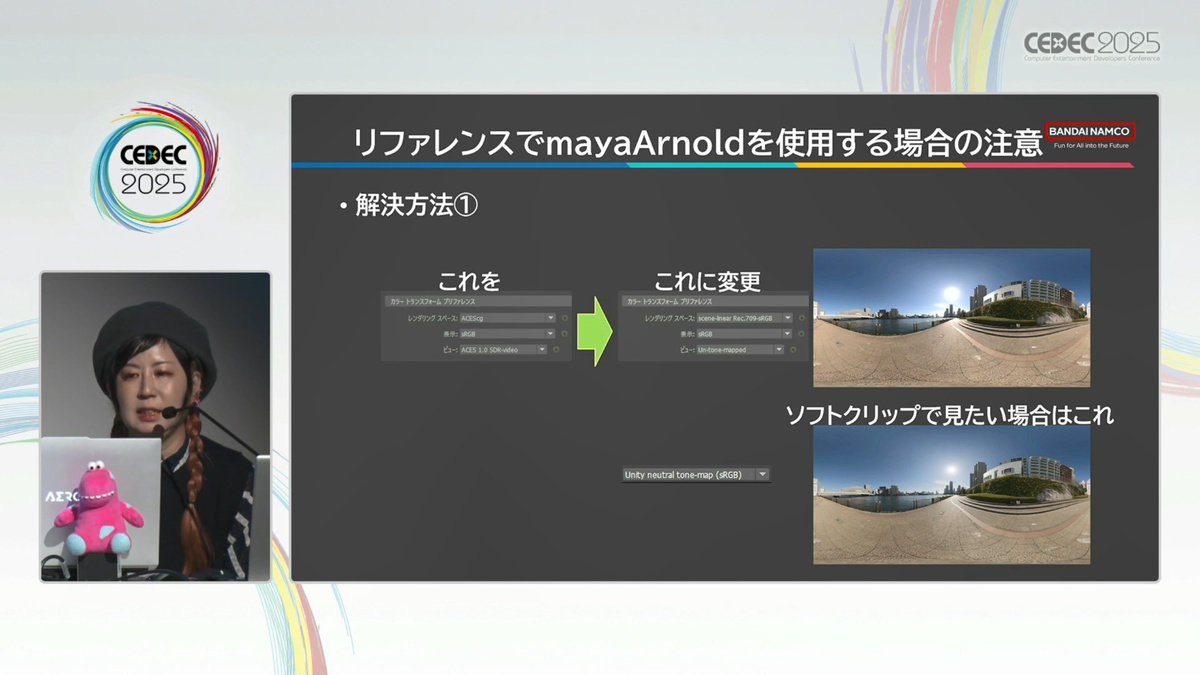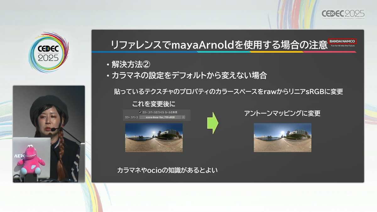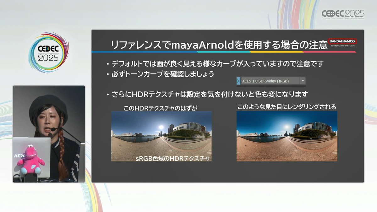 Mayaに標準搭載されているレンダリングエンジン「Arnold」をリファレンスに用いる場合は、デフォルトで画を良く見せるためのトーンカーブが入っていることや、HDR(物理ベースレンダリング)テクスチャで意図した色を表現する際の設定に注意しなければならないことが挙げられました。