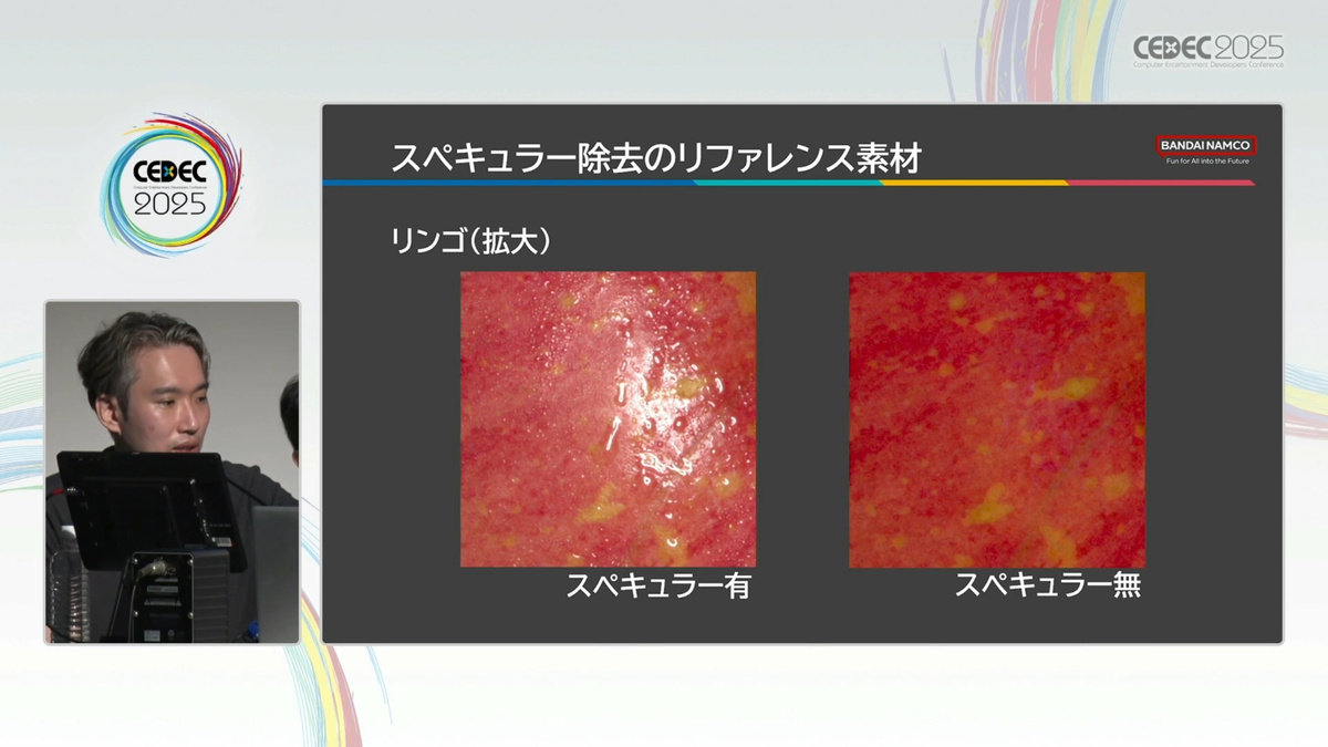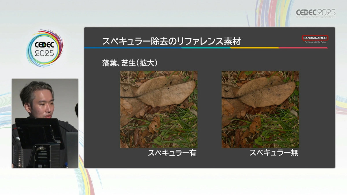 まずスペキュラーが物体の彩度や明るさに与える影響について、数点のリファレンス素材をもとに説明されました。