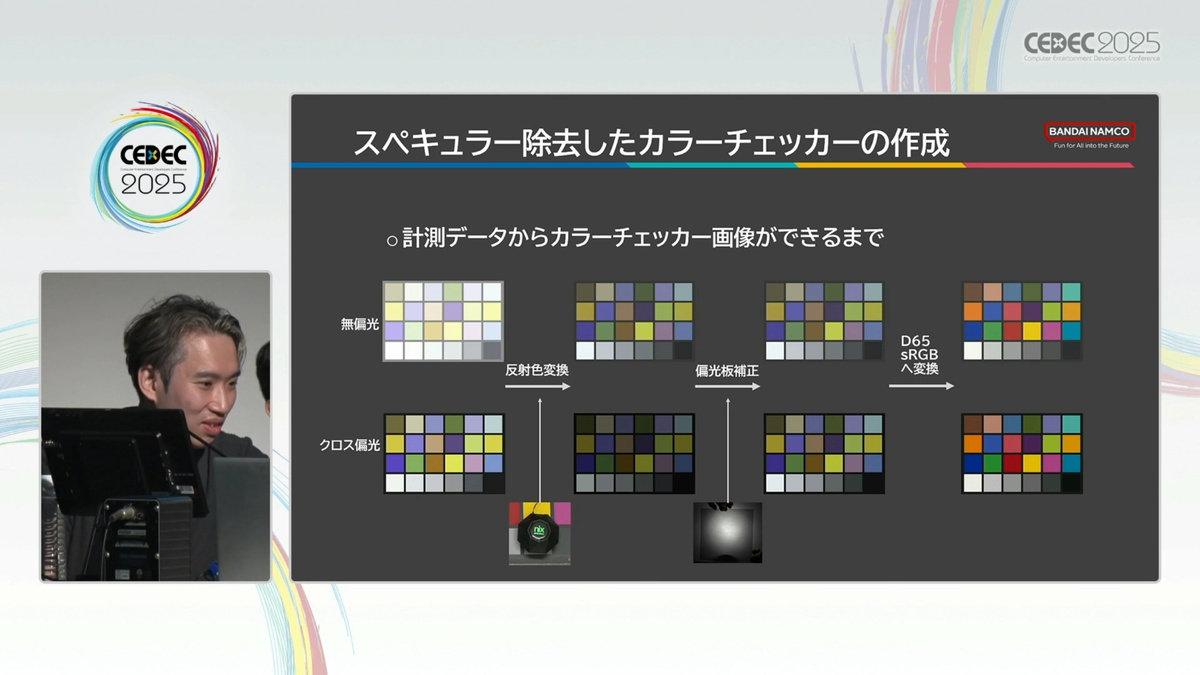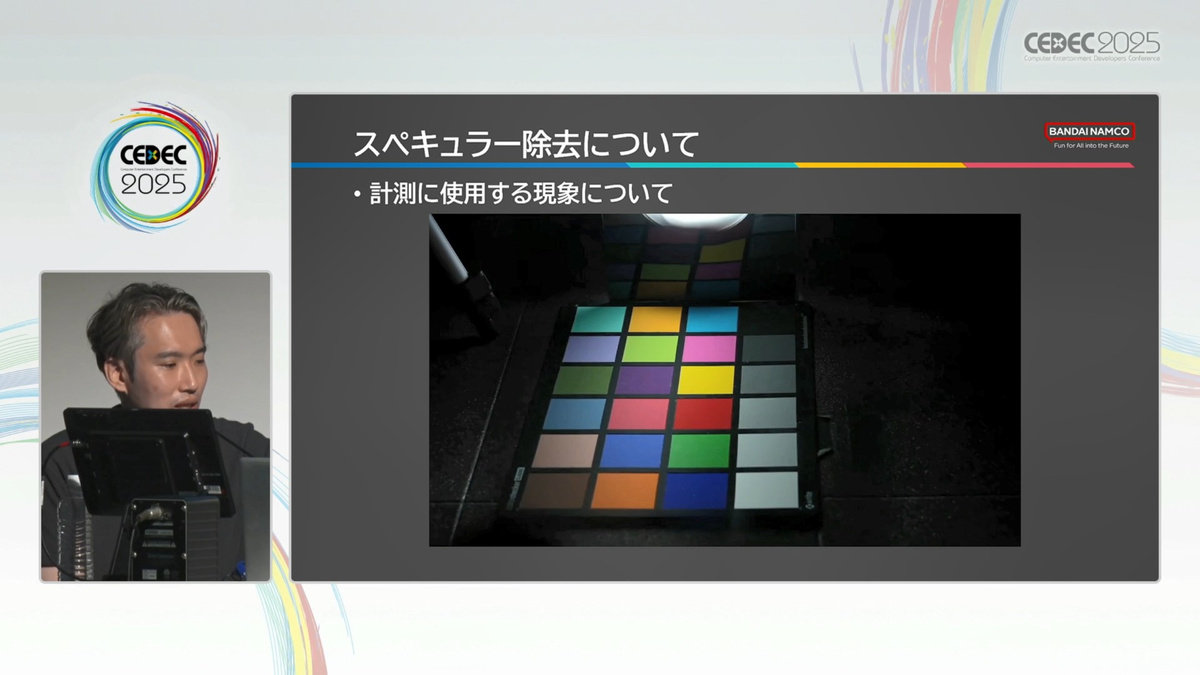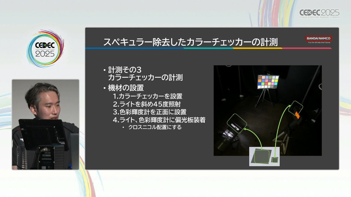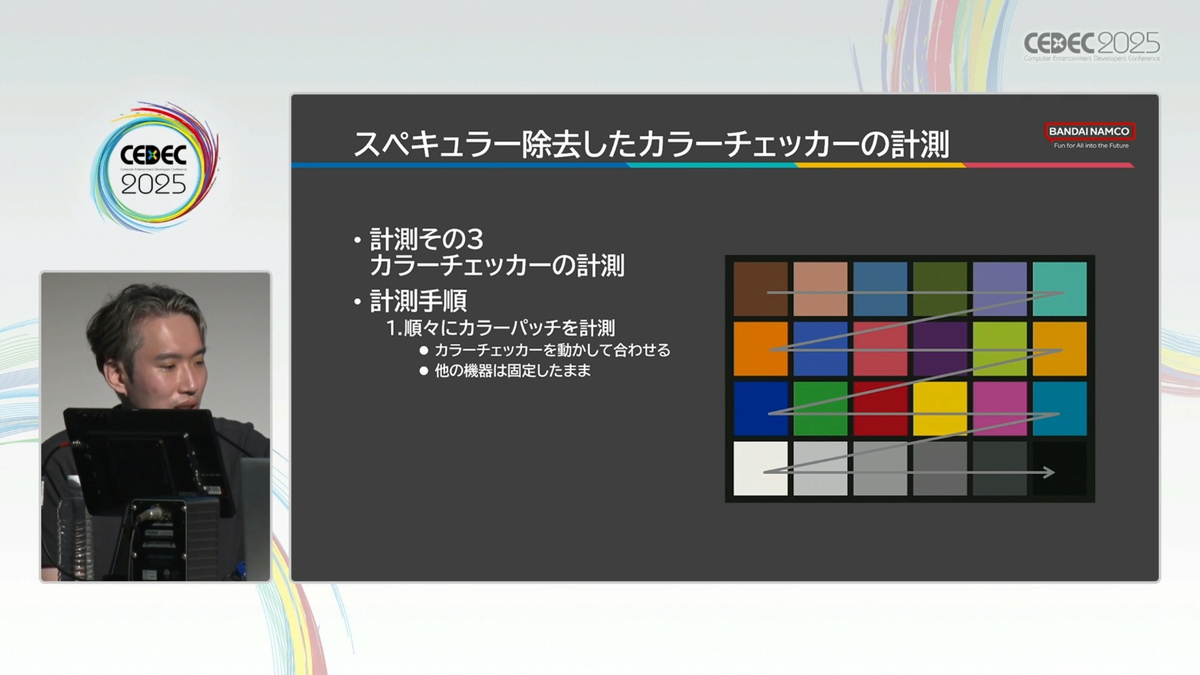 画像作成にあたり、カラーチェッカーのパッチ(それぞれの色のパネル)からスペキュラーを除去した色彩データを計測します。本来ならM3(※)で計測できる分光測色機を使用するべきところ、講演では代わりの方法が紹介されました。