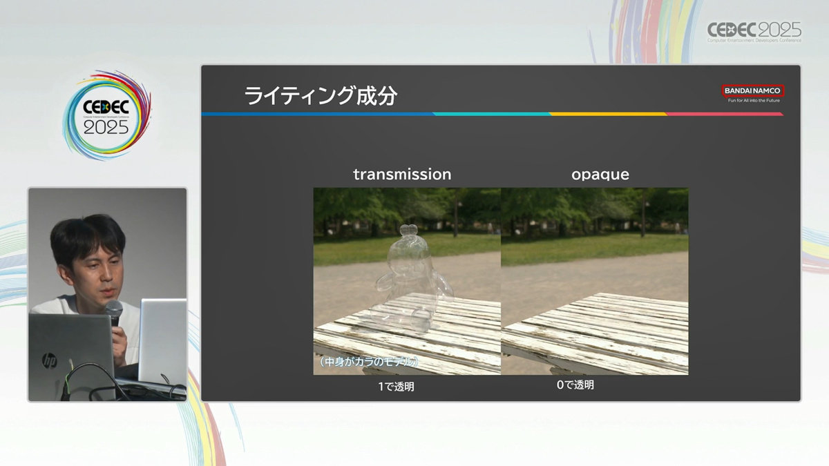 Transmission(透過)とOpaque(不透明)の違いについても説明された。