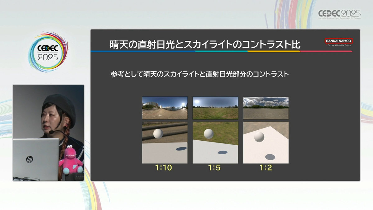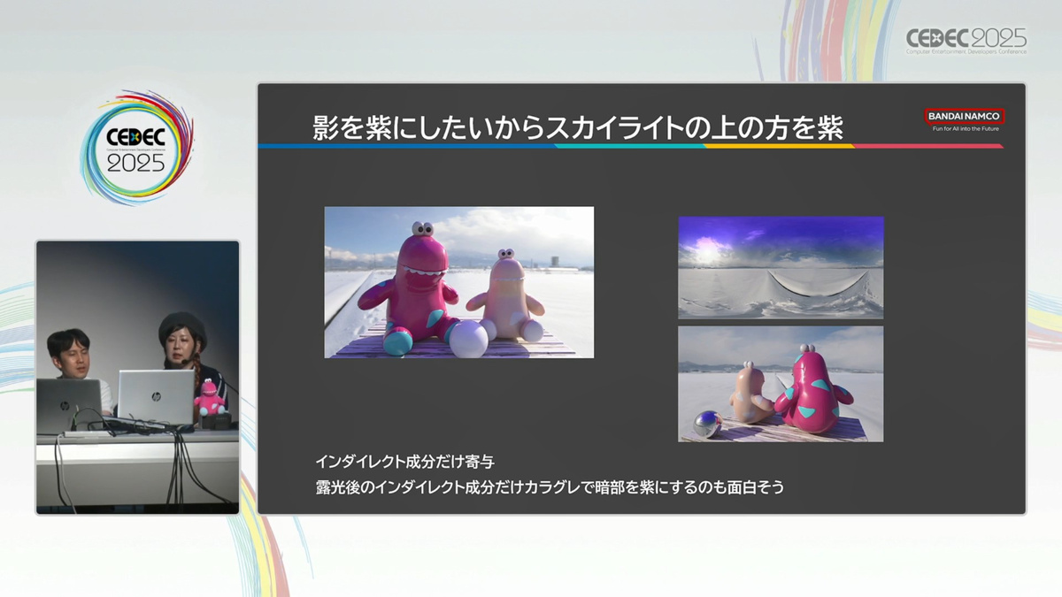 スカイライトの上部を紫にすることで、影に紫を混ぜ込んでいる。正面から見てもスカイライトが紫であることに気づかないが、キャラクターの背後に置かれた金属球(スライド右下の画像)に空の色が映り込んでいるのが確認できる