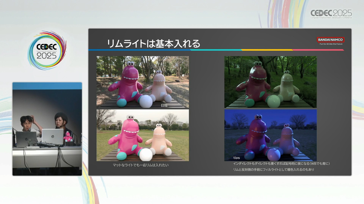また、ライトを青くするだけで記号的に夜を表現できる技法も紹介されました。人間の目が暗所視状態で見たものを青っぽく感じる特性を利用したもので、実写映画でも多用されています。