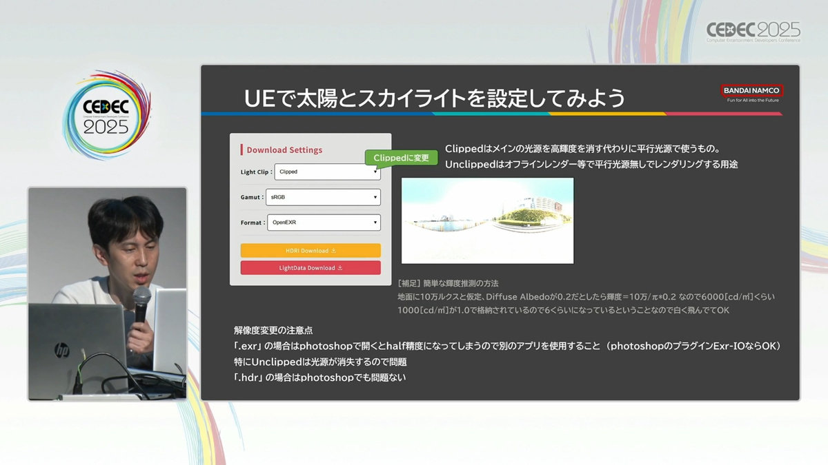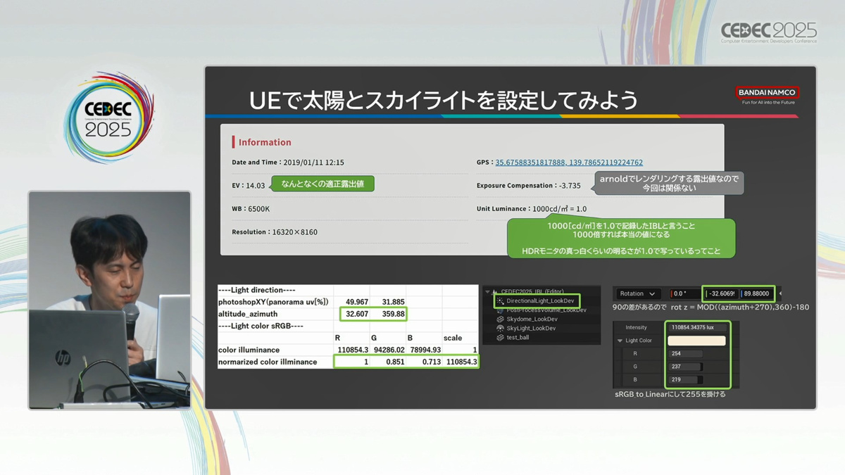 ライティング環境の明るさはEV(※)で調整します。EVについては、CEDEC2024で同社が実施した講演「アーティストのためのカメラの仕組み講座」で解説されています。