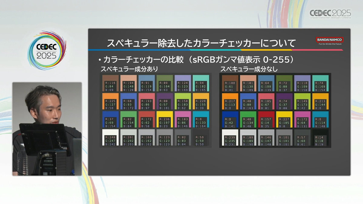 スペキュラーが物体の色彩表現にもたらす効果は、カラーチェッカーの数値より確認できます。