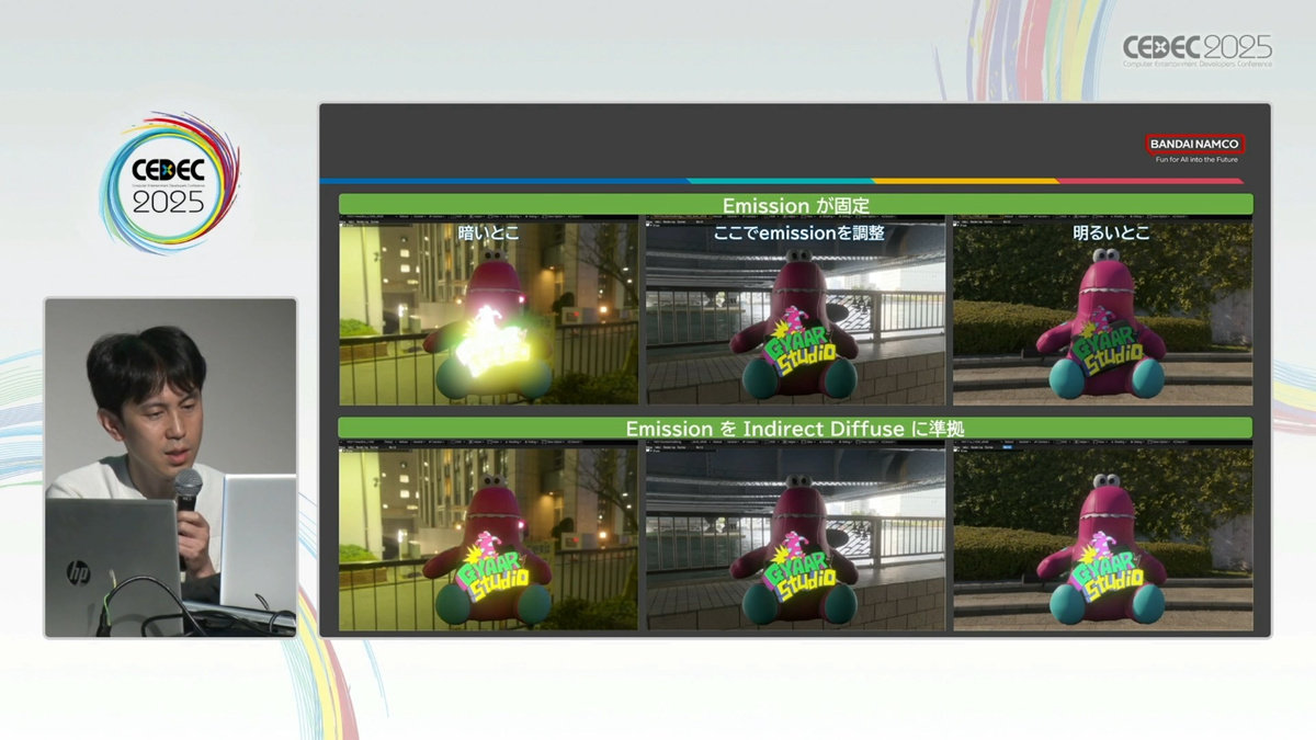 Indirect Diffuseを用いた明るさ・色の調整手法は、Emissionが暗所で目立ちすぎる/明るい場所で発光が足りない場合の解決策としても利用できる。