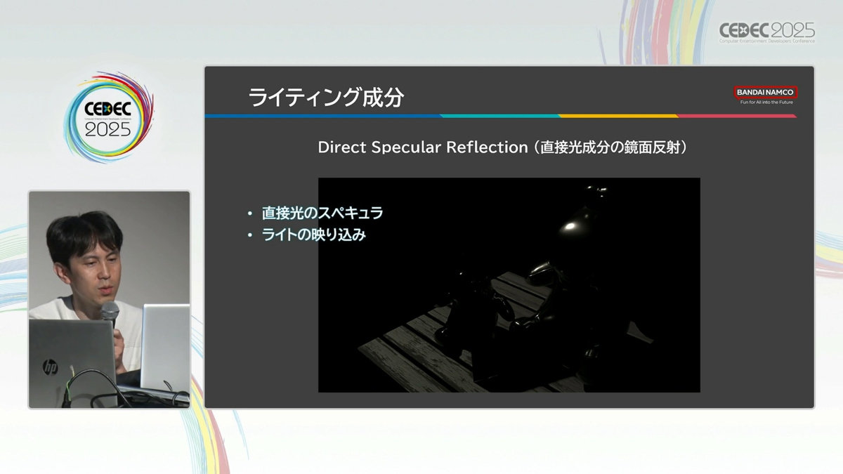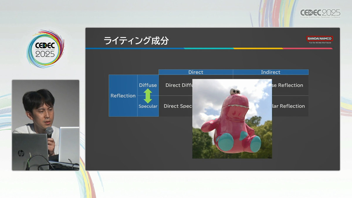 しかし本講演ではこれ以降、反射の種類を指し示す際、「拡散反射」を単に「Diffuse」、「鏡面反射(特定方向へ指向性を持つ反射)」を単に「Specular」とよぶ場面が存在します。