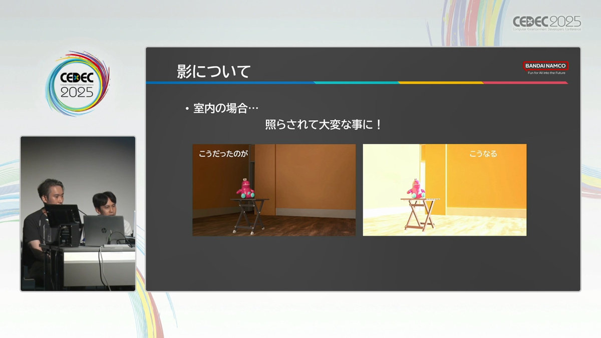 たとえば、屋外でできる影を薄くしたい場合、直接影の濃さを変えると室内の明るさ設定にも影響が及んでしまいます。そのため、間接光の色や明るさを調整することが推奨されました。