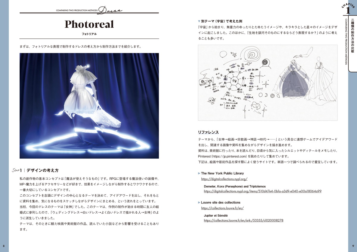 ウェディングドレスをイメージした衣装『Handmade wedding dress』および、十二単を彷彿とさせる着物の衣装『Japanese Costume』が紹介されている(画像はボーンデジタルの書籍ページより引用)