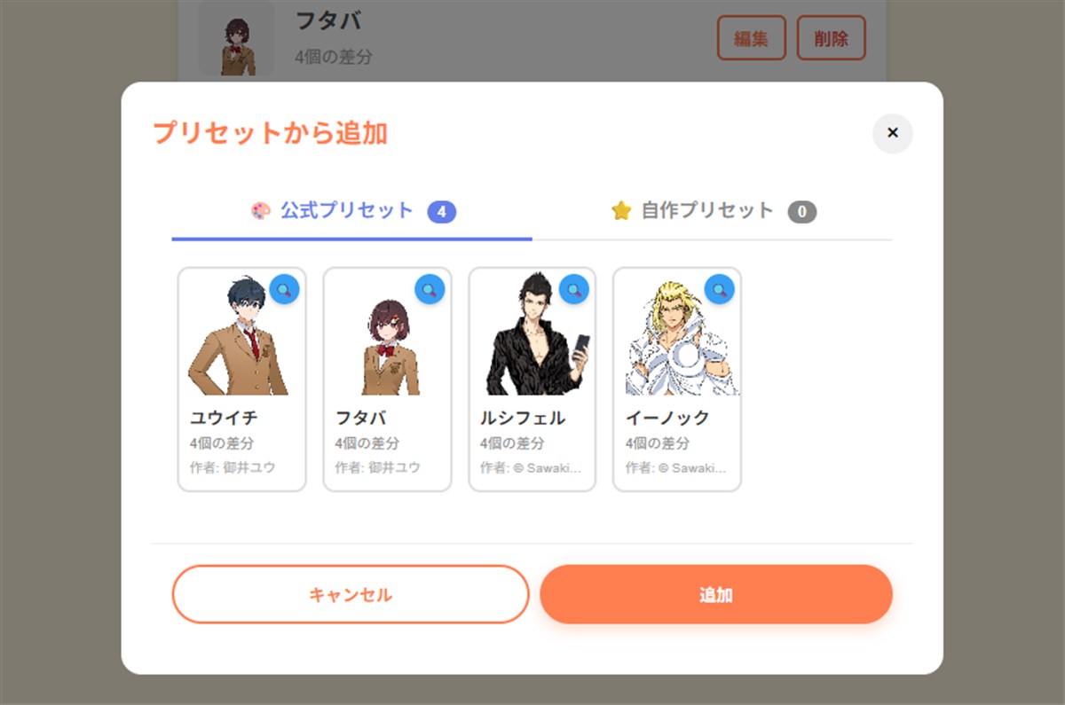 イーノックおよびルシフェルの立ち絵素材は、マイページのゲーム編集画面から追加することで使用可能。それぞれ表情差分として「通常/笑顔/驚き/困る」の4種類が用意されています。