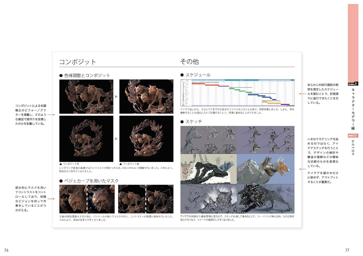 コンポジットやシェーディング、ライティング、マテリアル制作のポイントといった作品で用いた技法などが解説されているほか、制作スケジュールなどの参考情報も紹介。実制作に取り組む最中だけでなく、制作に着手する前から活用できる知見なども語られています。