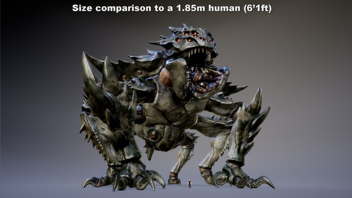 厚い外殻に覆われた全長50メートル超の巨大クリーチャー「Megaspikan」と、その幼体の3Dモデルアセットです。歩行や攻撃動作といったアニメーションが、親には30種類、幼体には16種類用意されています。