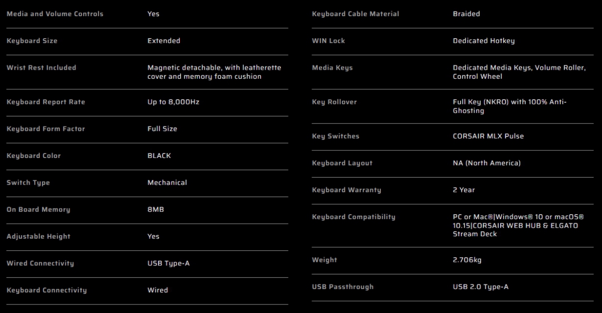 キースイッチは、押下圧45g、アクチュエーションポイント2.0mm、キーストローク3.6mmの「CORSAIR MLX Pulse」を採用。また、はんだ付け不要でキースイッチを交換できるホットスワップにも対応しています。