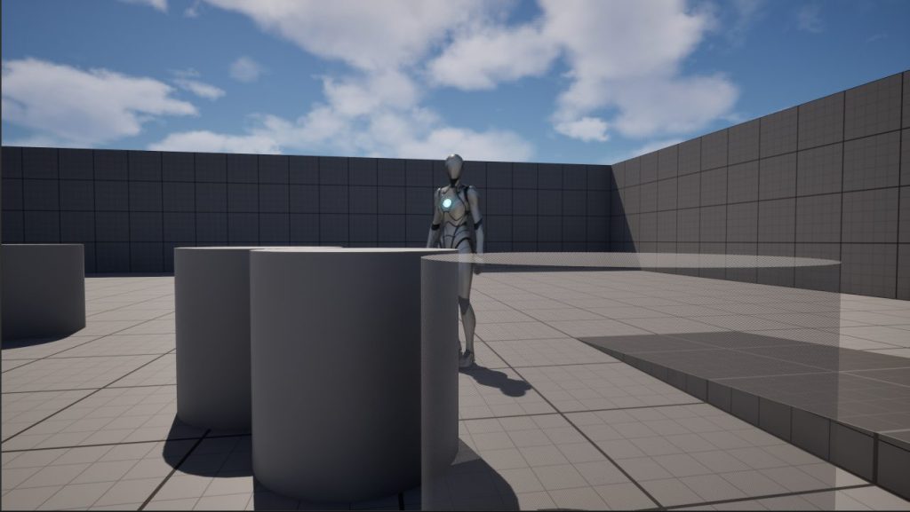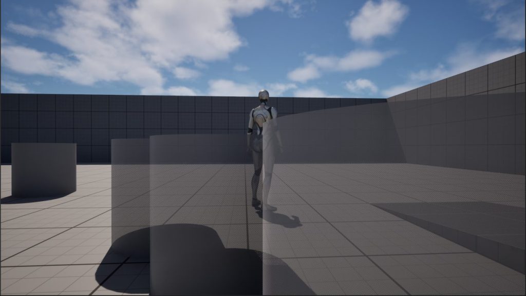3Dゲームなどでは多くの場合、壁や木といった障害物の裏側にキャラクターの全身または一部分が隠れて見えなくなっている際に、ディザリング(※)によって疑似的にオブジェクトを透過させる処理が施されます。