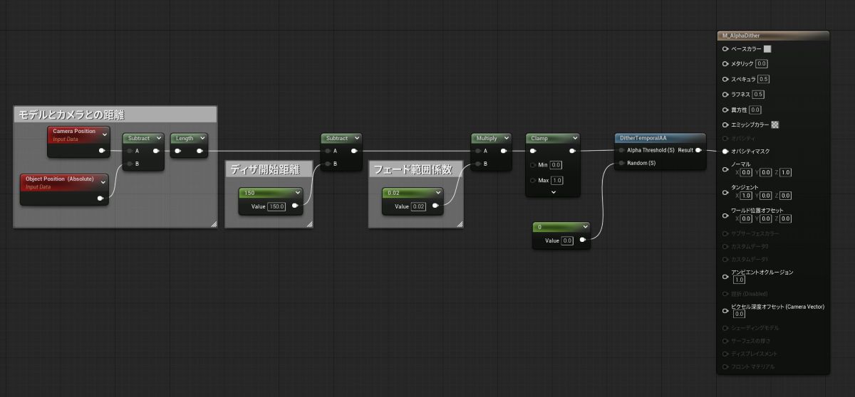 記事では、Unreal Engine 5.5.4における「背景アルファディザ」の実装方法を解説。専用マテリアルを作成し、モデルの座標とカメラの距離に応じてディザリング処理を適用できるようにノードを組む過程を紹介しています。