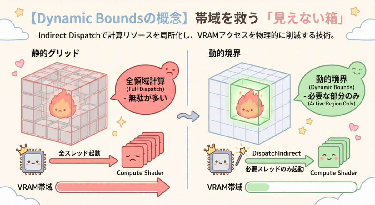 記事中で紹介された例では、描画負荷の軽減策として「占有マップ(Occupancy Map)」と「動的境界(Dynamic Bounds)」を導入しています。流体が存在する領域のみを計算・描画対象とすることで、無駄な処理を省いています。これにより、影生成のコストを従来の3分の1にまで削減することに成功しました。