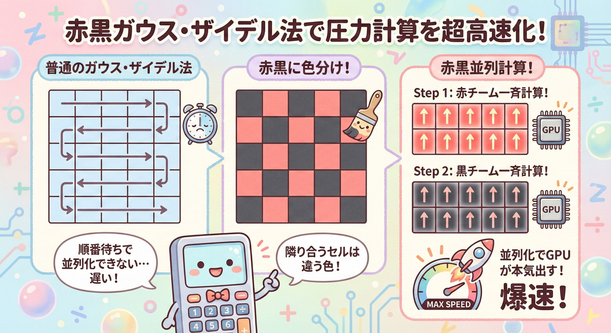 具体的には、赤と黒のセルに分けて並列化を図る「RBGS(Red-Black Gauss-Seidel)法」や、収束を早める「SOR(Successive Over-Relaxation)法」、そして粗いグリッドで低周波誤差を解消する「マルチグリッド法(Multigrid Method)」が紹介されました。