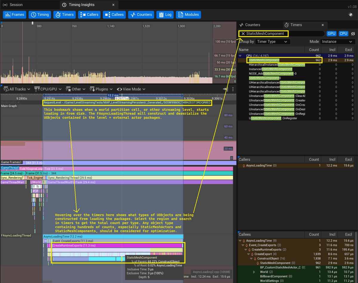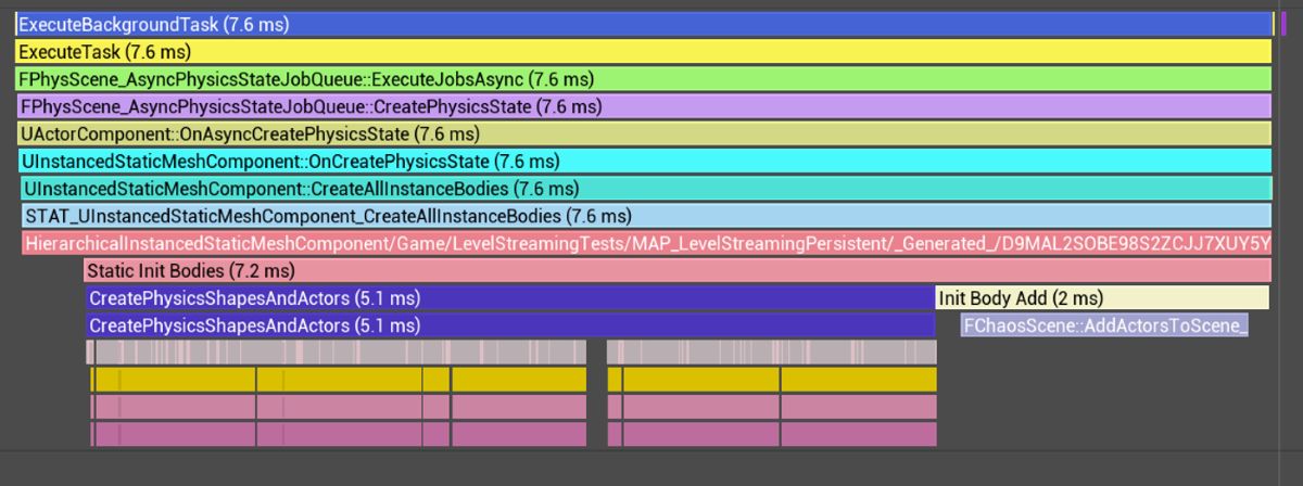 ガイドではまず、パフォーマンス分析ツールである「Unreal Insights」を利用した負荷の特定手法を推奨しています。レベルの読み込み時には、環境アセットのロード、アクタのスポーン、物理計算のセットアップ、ガベージコレクション(Garbage Collection)といった多数のタスクが実行されています。