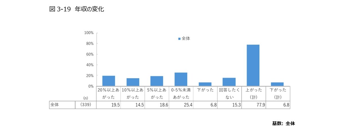 年収に関しては、2024年1月~12月における世帯年収が平均833.99万円、個人年収が平均674.21万円という結果に。2023年の年収と比較して77.9%が「年収が上がった」と回答しています。