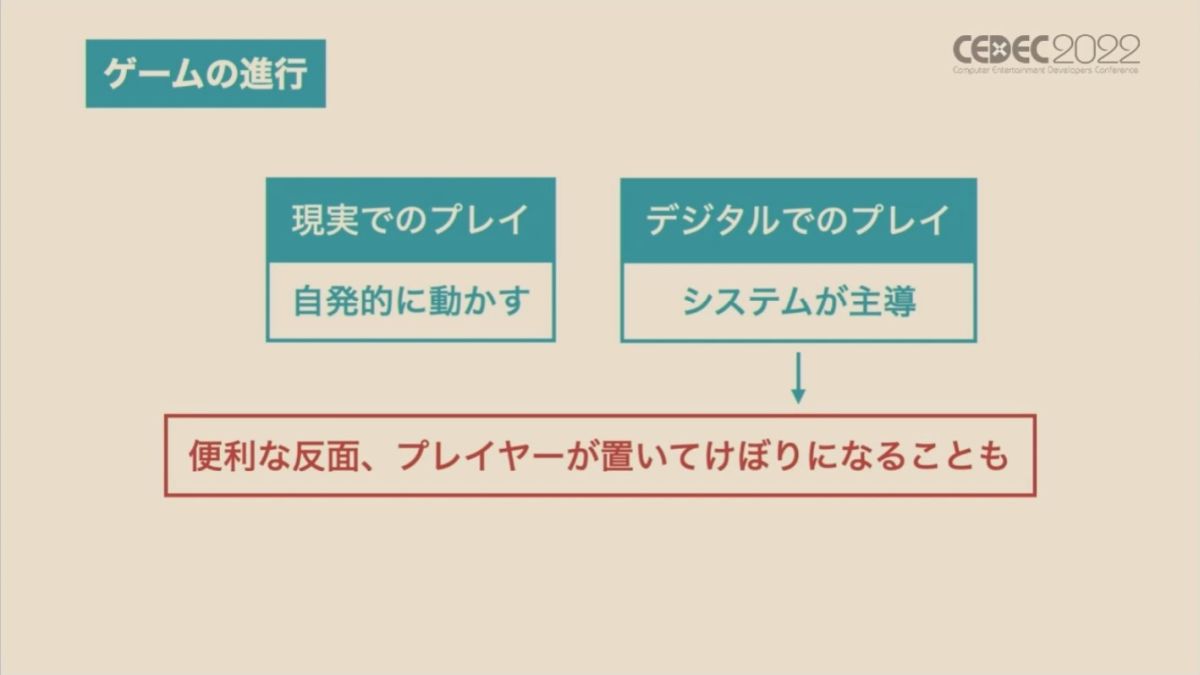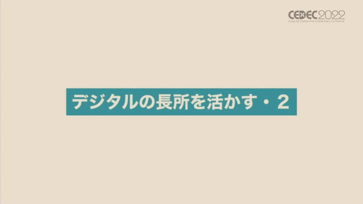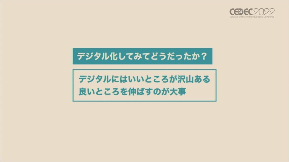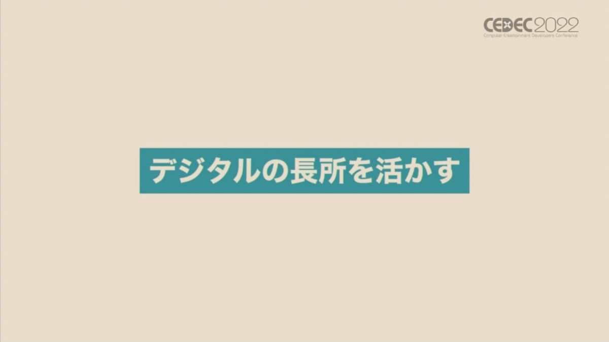 デジタル化によって抜け落ちてしまう要素を全て補完するのは難しいですが、いくつかの解決策は見つけることができています。デジタルの長所を伸ばすことを意識すれば、トータルでもともとの面白さに匹敵するゲームをつくることが可能だと新藤氏は述べています。