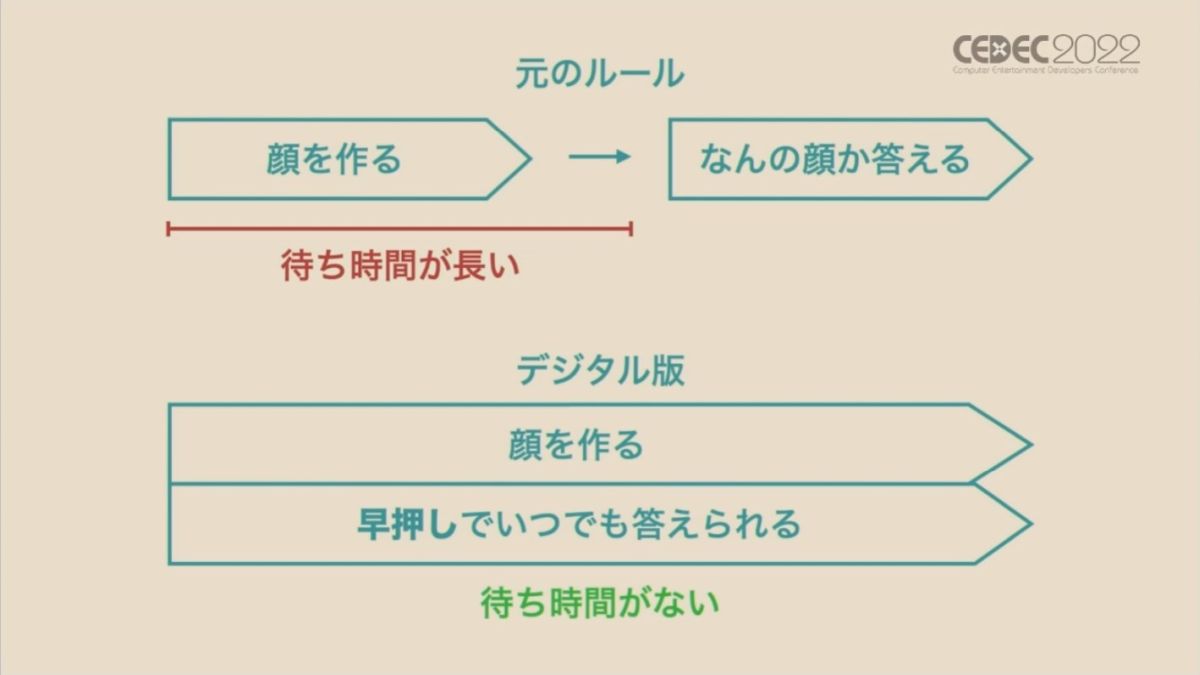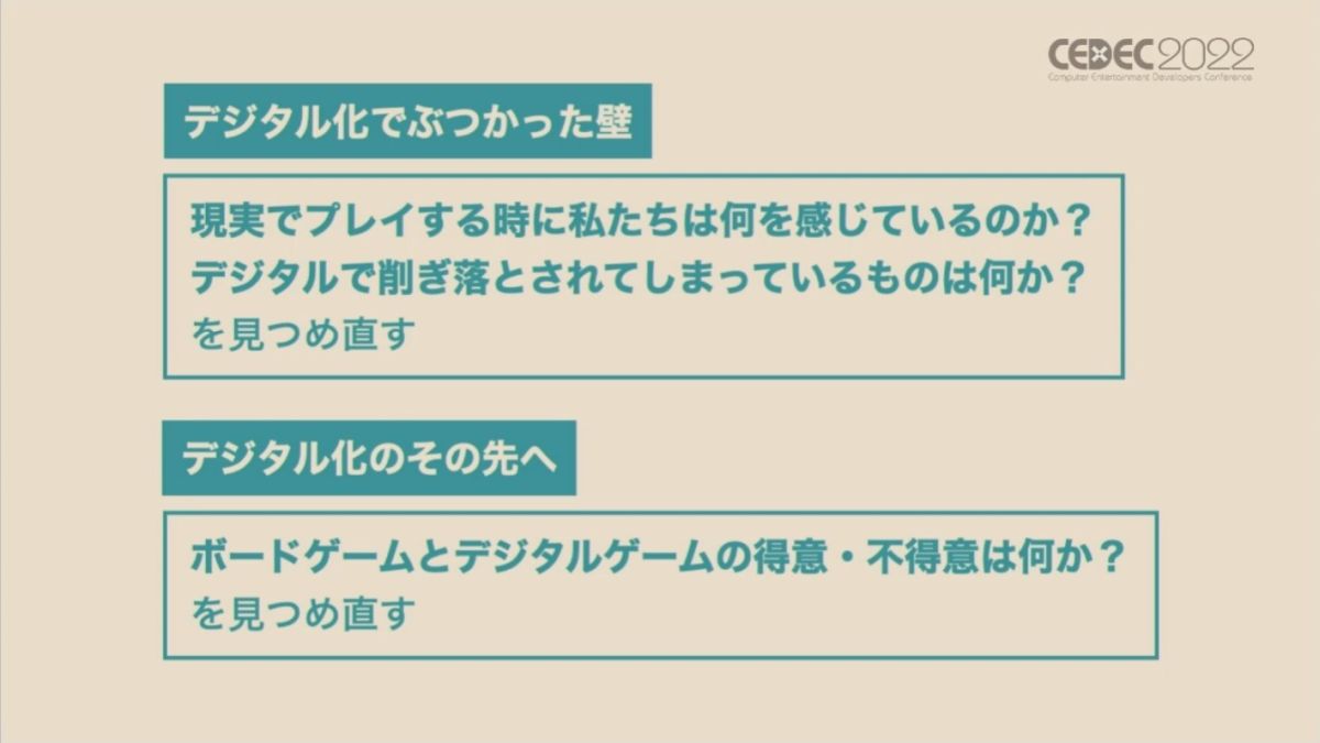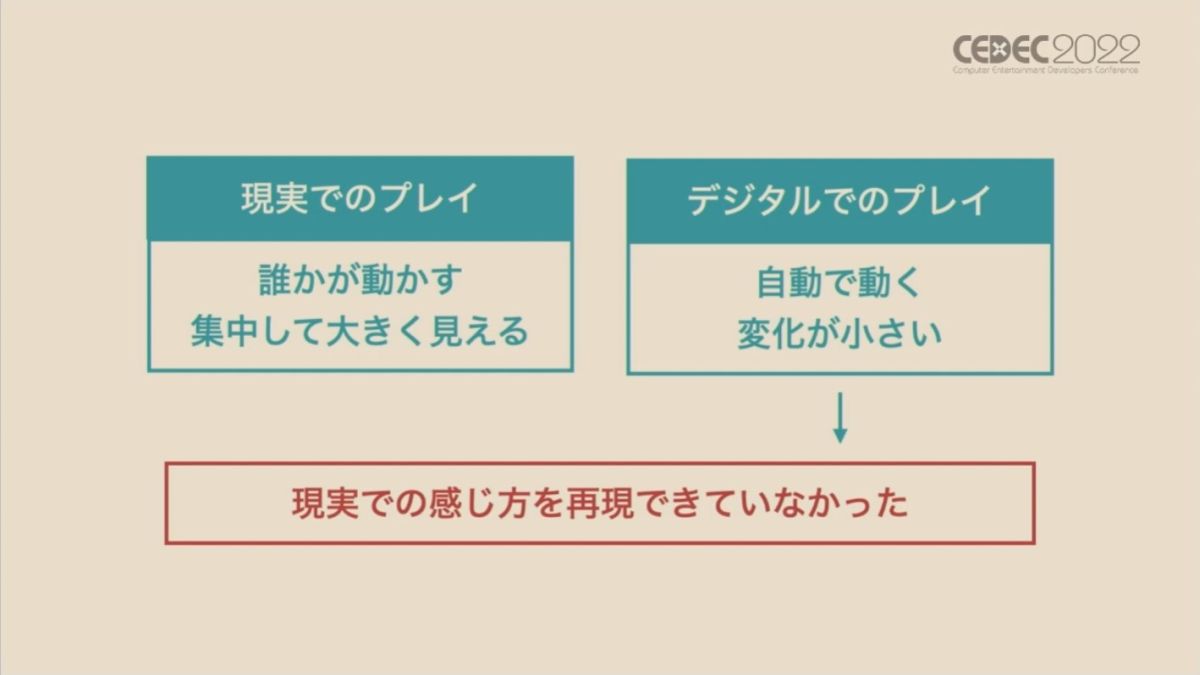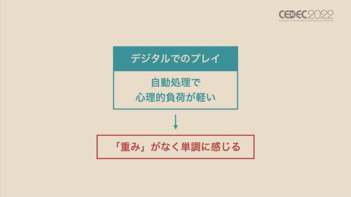 デジタル化によって抜け落ちてしまう要素を全て補完するのは難しいですが、いくつかの解決策は見つけることができています。デジタルの長所を伸ばすことを意識すれば、トータルでもともとの面白さに匹敵するゲームをつくることが可能だと新藤氏は述べています。