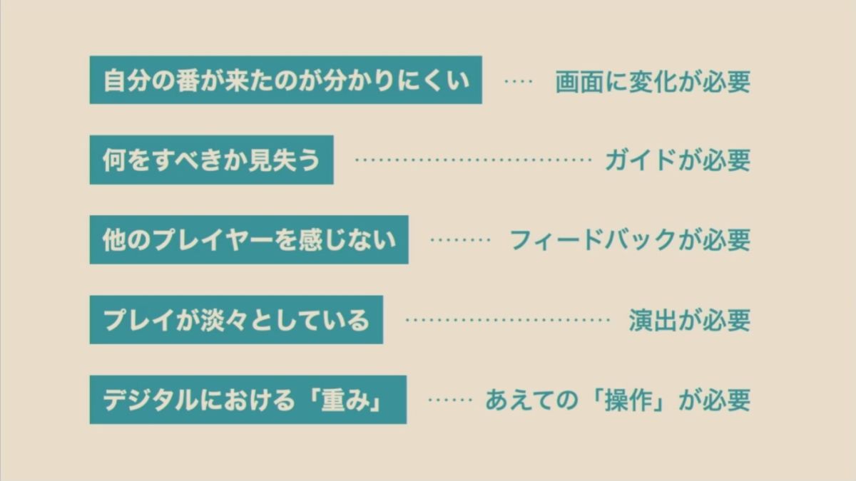 これらの事例は、単純にデジタル移植するだけでは現実でのプレイ感とは大きく異なってしまうことを示すだけでなく、デジタルならではのやり方で作品を補強することでプレイ体験が大きく向上、あるいは新たな遊び方を創造できる可能性を示しました。