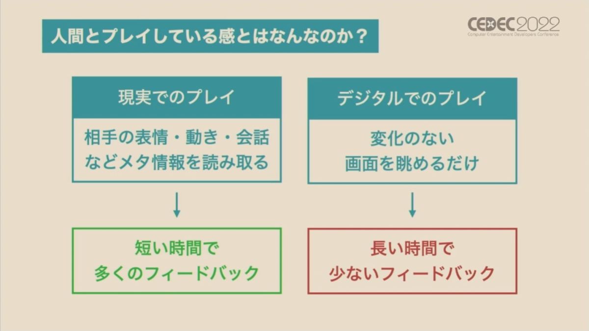 このことから、「人間とプレイしている感」とは相手の表情・動き・会話などのメタ情報から、短い時間で多くのフィードバックを得ていると考えました。