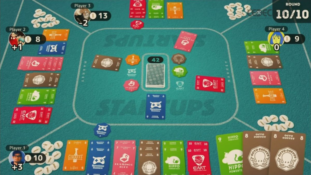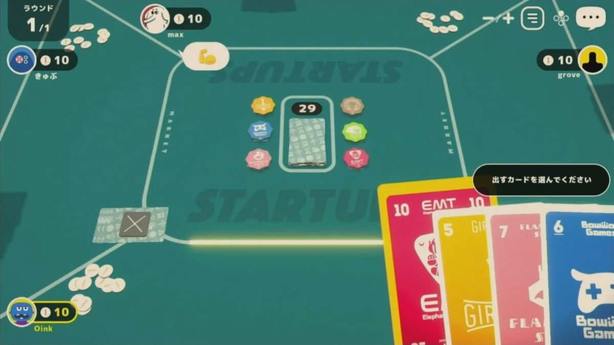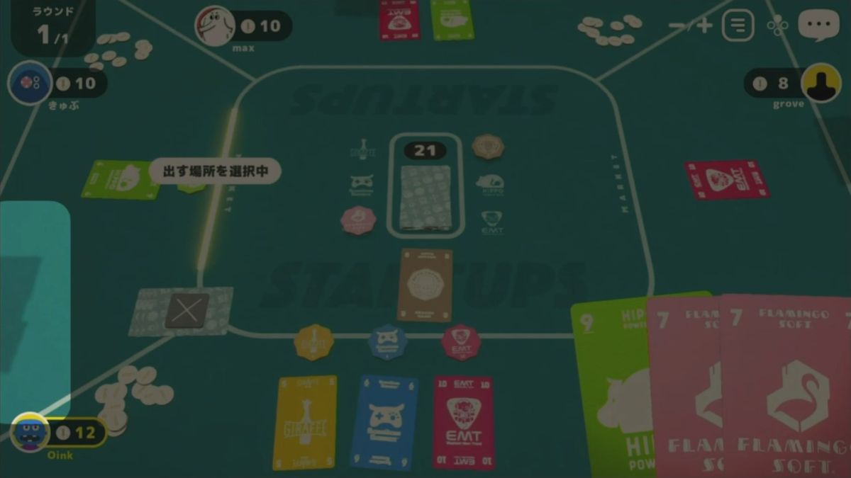 『スタータップス』では、画面の制約のため手札を全て表示するスペースがありません。他のプレイヤーの様子は手札の影として表示されています。こうしたリアルタイムのフィードバックは、この後に実装されるゲームでも数多く取り入れられています。