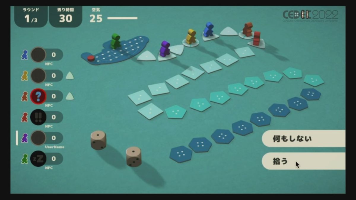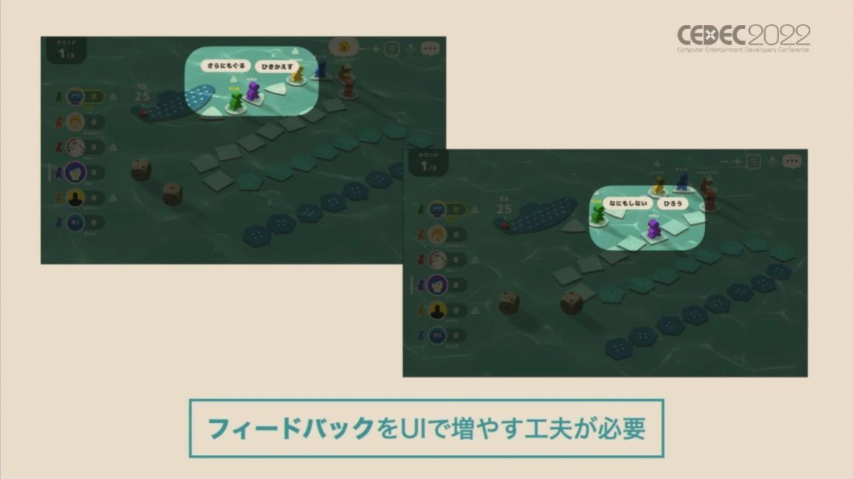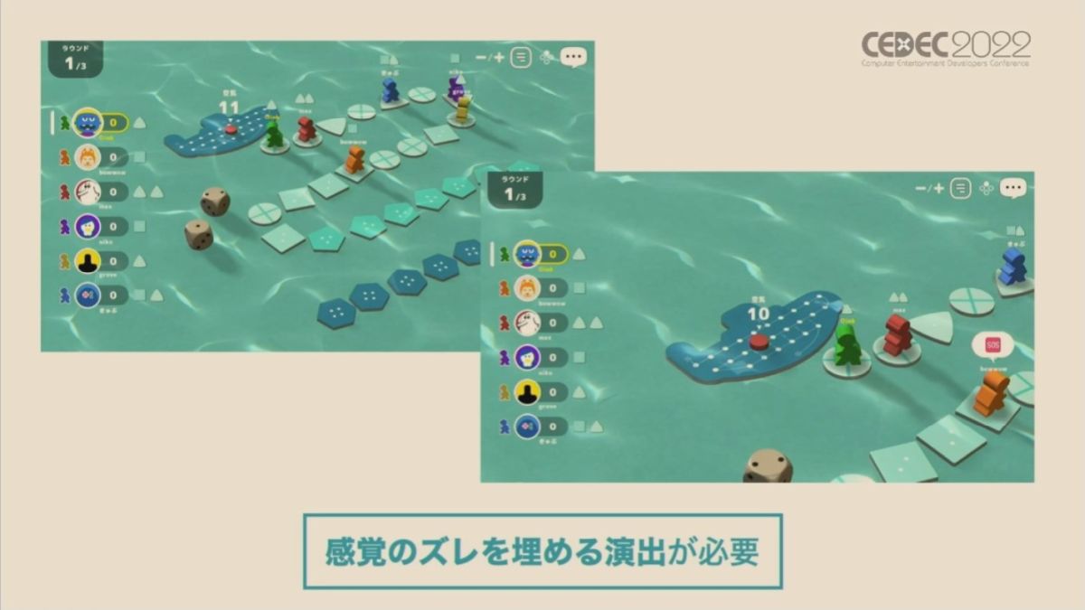 デジタル化にあたって「他のプレイヤーを感じない」という点も大きな問題となりました。現実のボードゲームと同じ遊びなのに、デジタル化した途端に他のプレイヤーを感じなくなってしまったと言います。せっかくリアルタイムで対人プレイをしているのに、CPUとプレイしているのと同じ感覚では意味がありません。