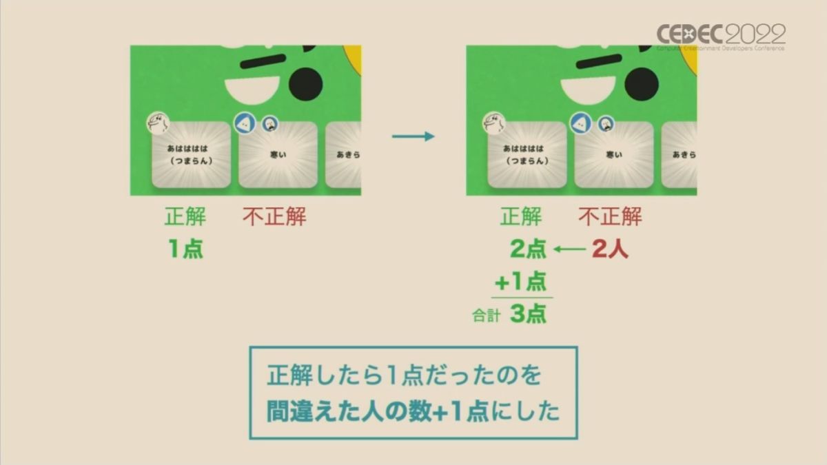 このルール変更で、ボードゲームにはなかった「早めに回答するか」「ギリギリまで観察して確実に正解するか」というジレンマが生まれました。このジレンマに合わせて、一番最初に回答して正解したプレイヤーにボーナス点が与えられるという得点に関するルールも変更されました。これにより緊張感が持続し、最後まで飽きずにプレイできるようになりました。
