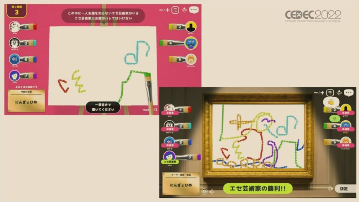 現実で『エセ芸術家ニューヨークへ行く!』をプレイすると、答え合わせのあとに「この絵なんだと思った?」という会話が行われ、次回以降のプレイの工夫につながっていました。これがプレイヤーにとっては重要なフィードバックでしたが、この会話はルールに則って行われていたわけではないので、デジタル版では生まれませんでした。