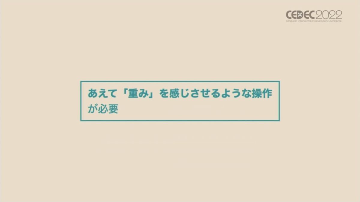 重みに対する対策として、プレイヤーが面倒に感じない範囲であえて「重み」を感じさせる操作を加えて、単調さを軽減させました。